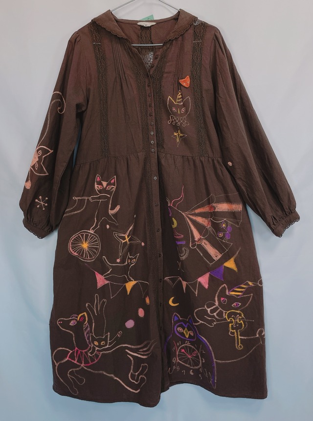 猫好きにはたまらない、手描きデザインの愛らしいブラウンのレースワンピースです。 ユニークな独特な猫のイラストは、全て一つ一つがクリエイターの想いを込めた手描きです。ユーモアたっぷりな、サーカスをテーマにしたワンピースは、見る人を笑顔にさせること間違いなし。 軽やかな素材感とゆるやかなシルエットで、リラックスした着心地です。 普段使いはもちろん、お友達とのお出かけにもぴったりです。 透け感のあるレースがフロントにあるので、夏に着る場合は、中のインナーをお忘れなくです。 ●素材 本体: 綿100% ●サイズ 丈 約114センチ 身幅 約50センチ ※サイズに関しまして、採寸は1つ1つ手作業で行っているため多少のズレが生じる場合もございます。 ※生地の特性により、誤差が生じる場合がございます。
