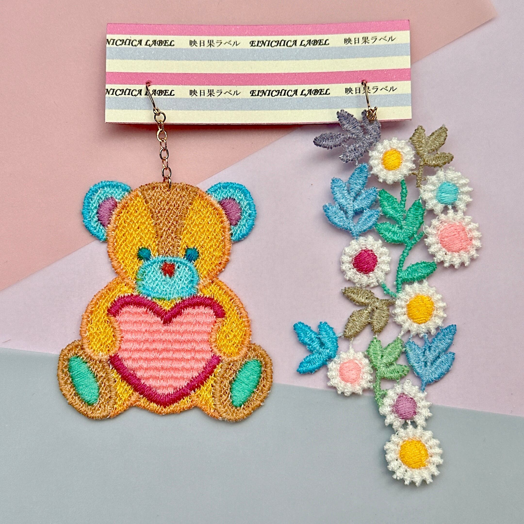 ひとつひとつが手染めしされた、カラフルなレースモチーフのピアス・イヤリングです。(パーツ交換可能です)
