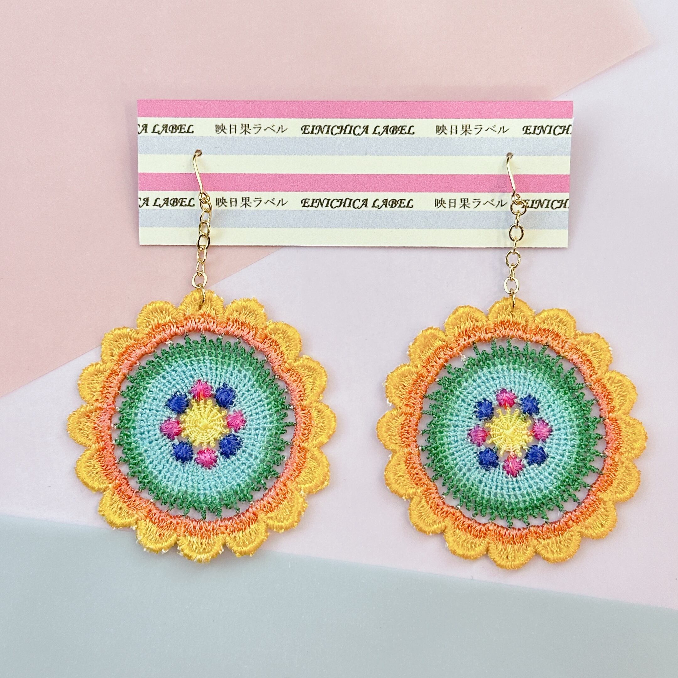 ひとつひとつが手染めしされた、カラフルなレースモチーフのピアス・イヤリングです。(パーツ交換可能です)