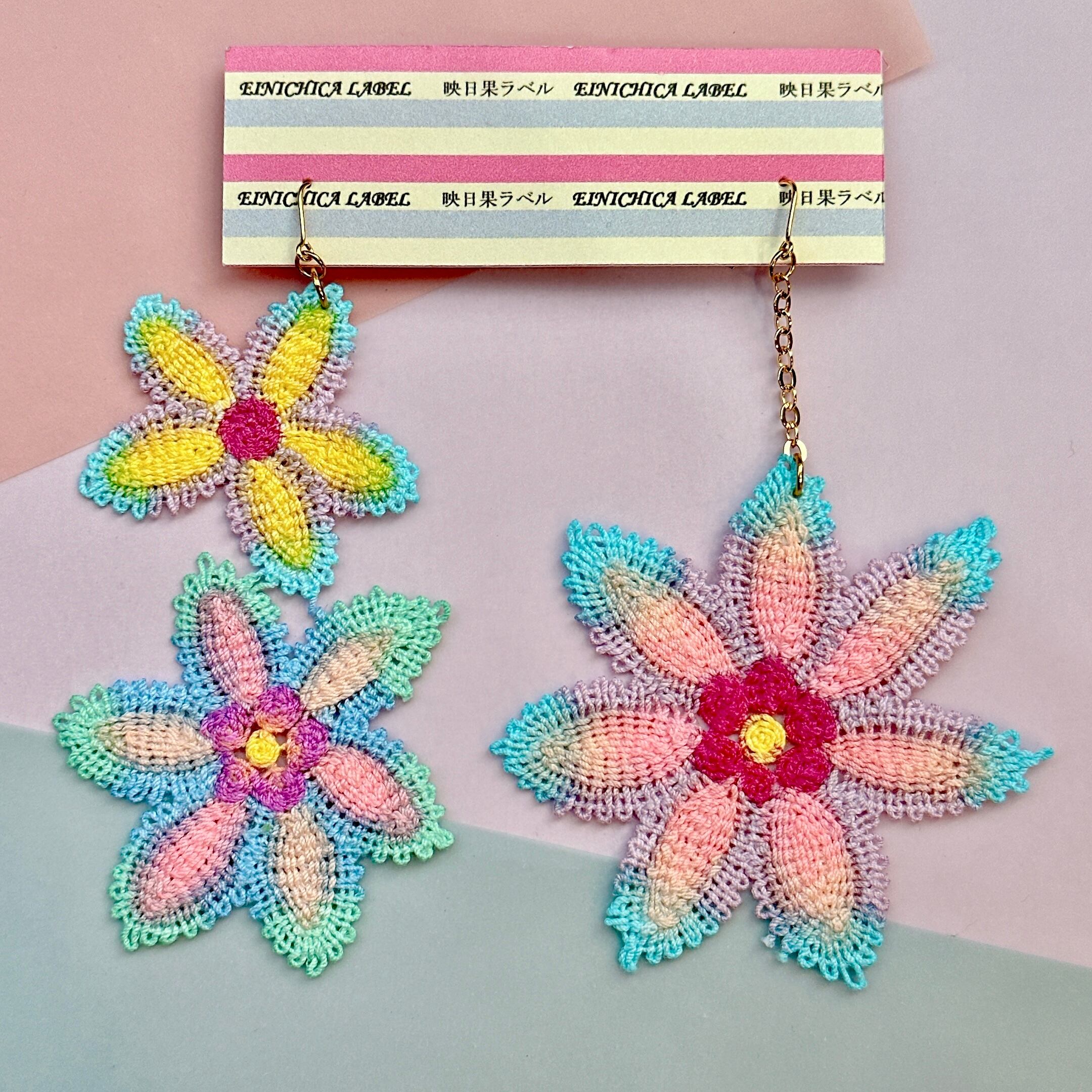 ひとつひとつが手染めしされた、カラフルなレースモチーフのピアス・イヤリングです。(パーツ交換可能です)