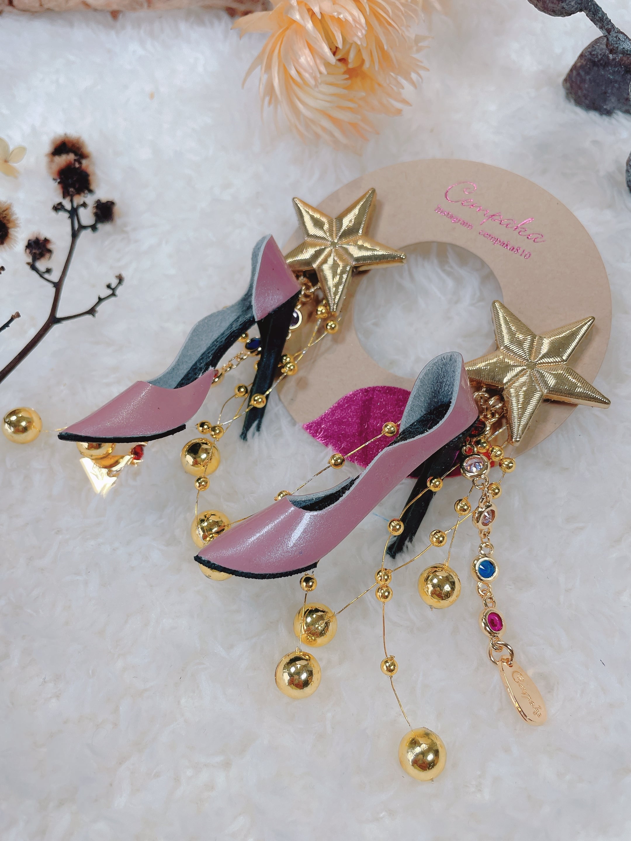 色んな模様のハイヒールに、賑やかな楽しいパーツ、海外のボタンなどで組み合わせられた、一点ものになります。