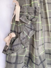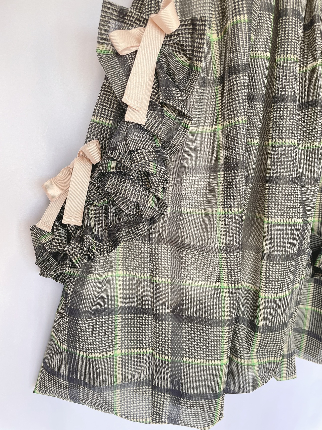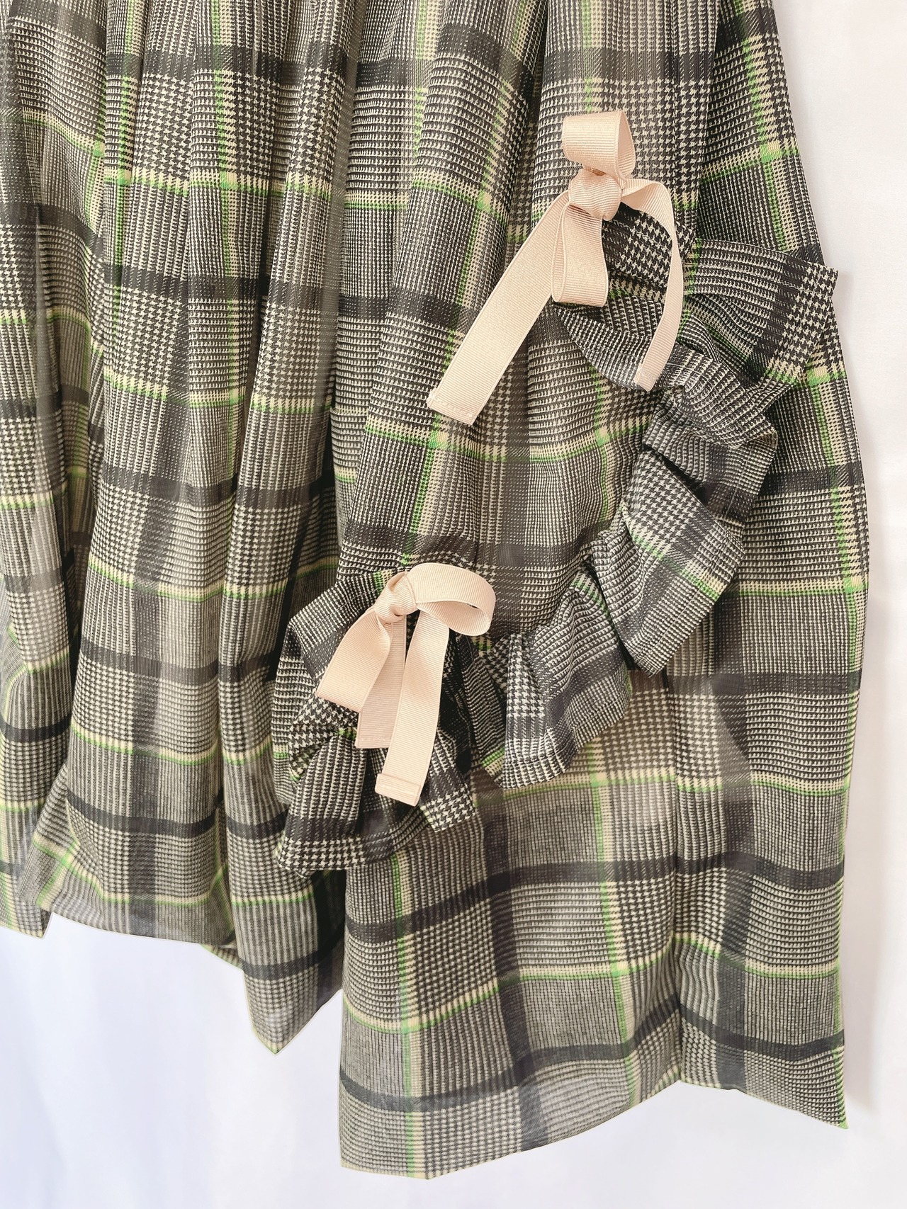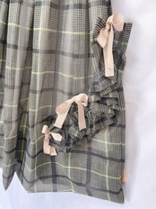 ウエスト部分のデニム素材と、チェック柄のフリルリボンが特徴のスカートです。