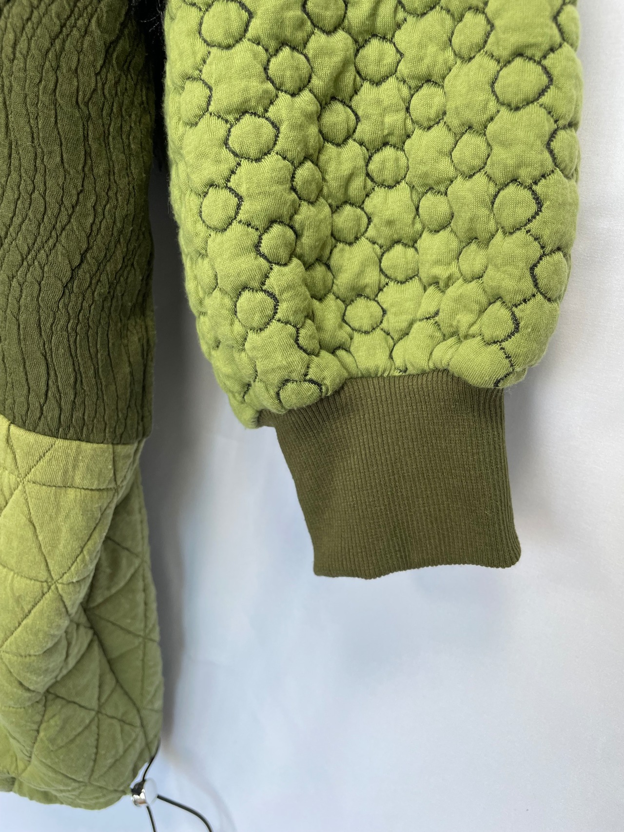 ジャガードとキルトの組み合わせが、見る者に新鮮な印象を与え、シンプルなスタイルにも華やかさをプラスします。