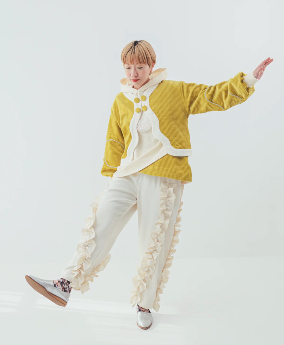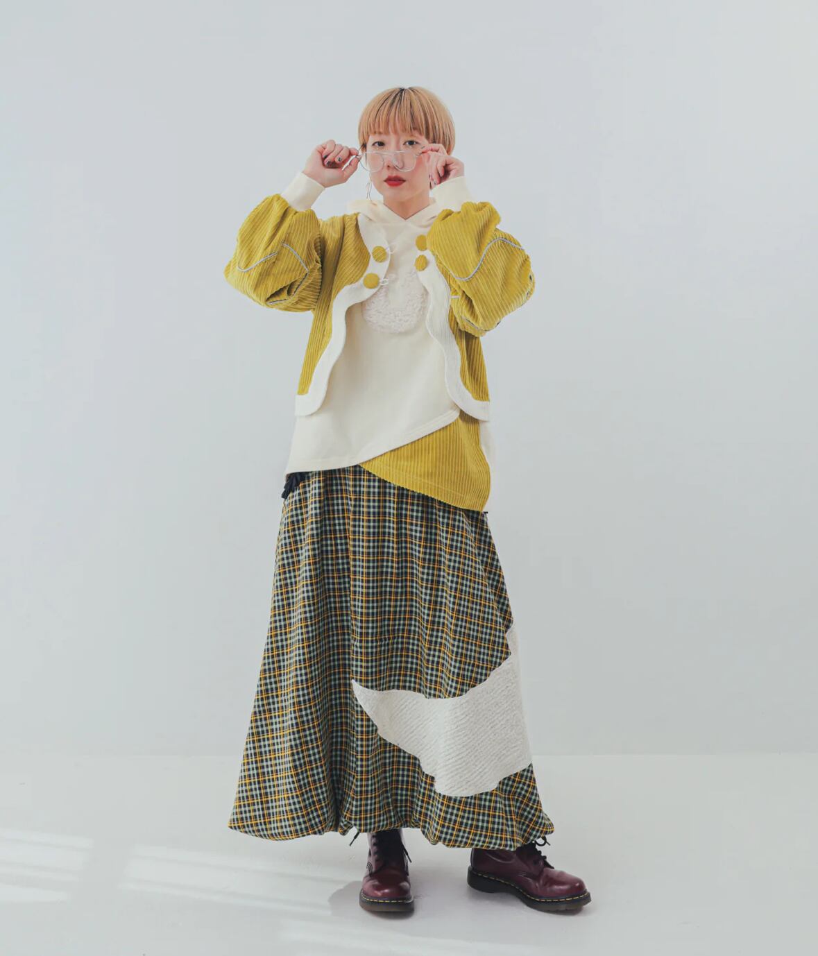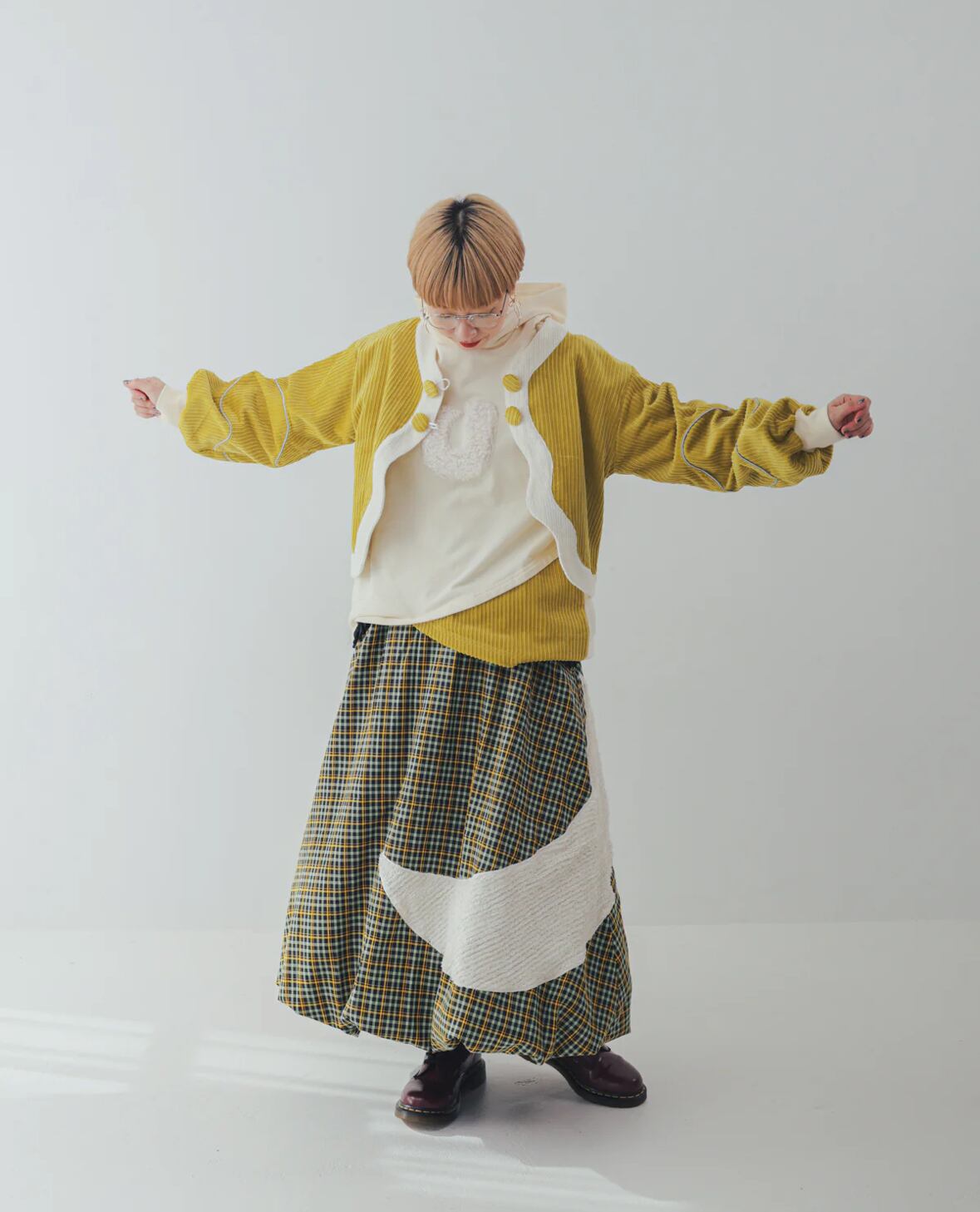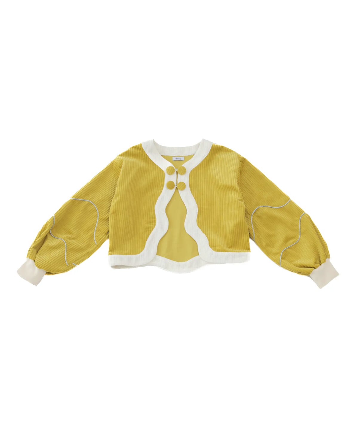 縦の畝が特徴的な秋冬ではお馴染みのコーデュロイ生地を使用したボレロは、差し色として使いやすいイエローとカーキの2色展開。ワンピースとの相性はもちろん、丈の短さを活かしたメリハリのあるコーディネイトが楽しめるのはボレロならでは。裾や袖のパイピングなどに波のようなデザインを施すことで、視覚的にも目を引くアイテムに仕上げました。