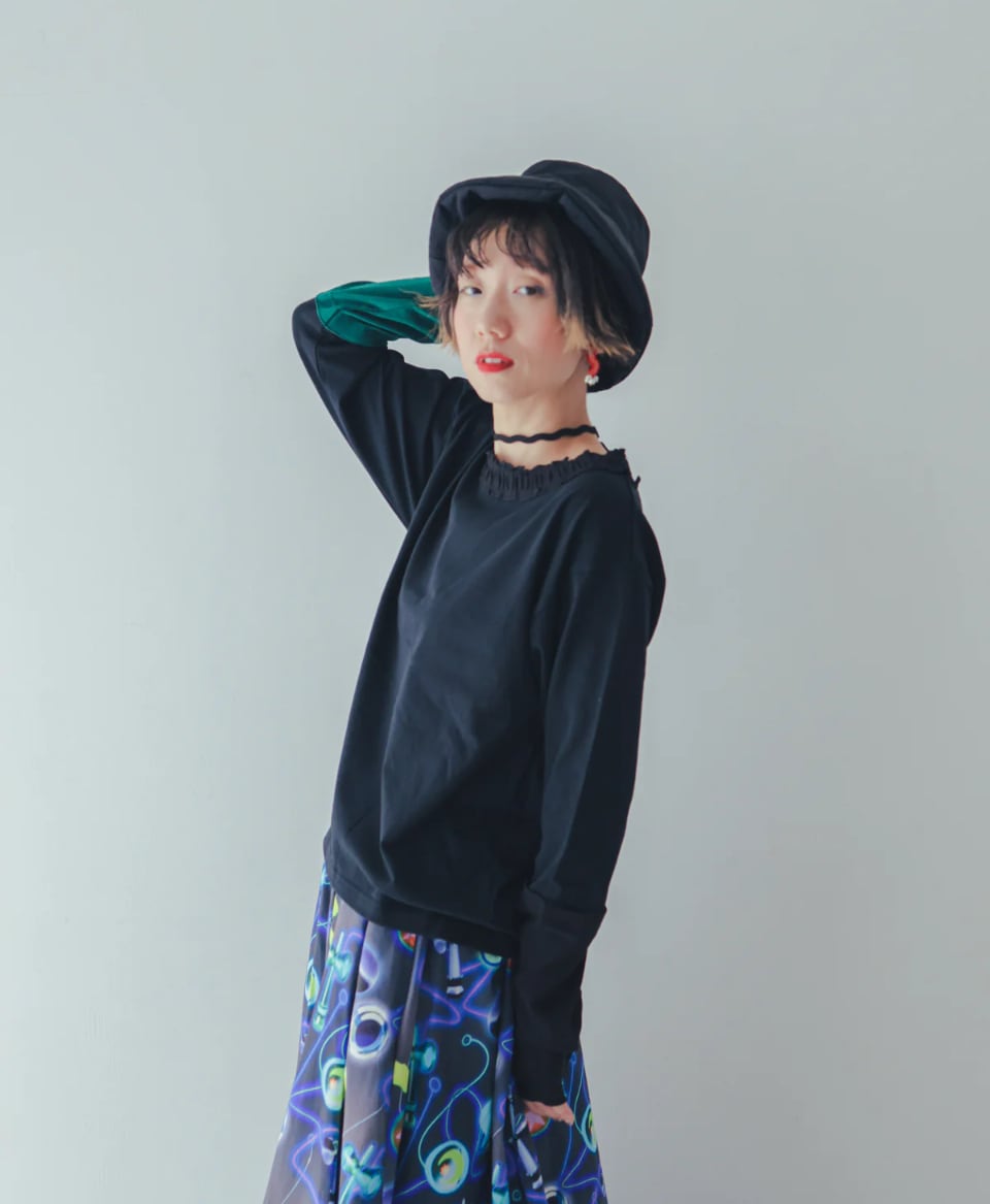 秋口には1枚で、寒さが深まる時期にはインナーとしても活躍する万能カットソーです。左右の袖を異なる配色にすることで、ポップな印象に。カーディガンなどの袖の先からチラリと色を見せてみたりと、レイヤードアイテムとしても効果を発揮する一着です。