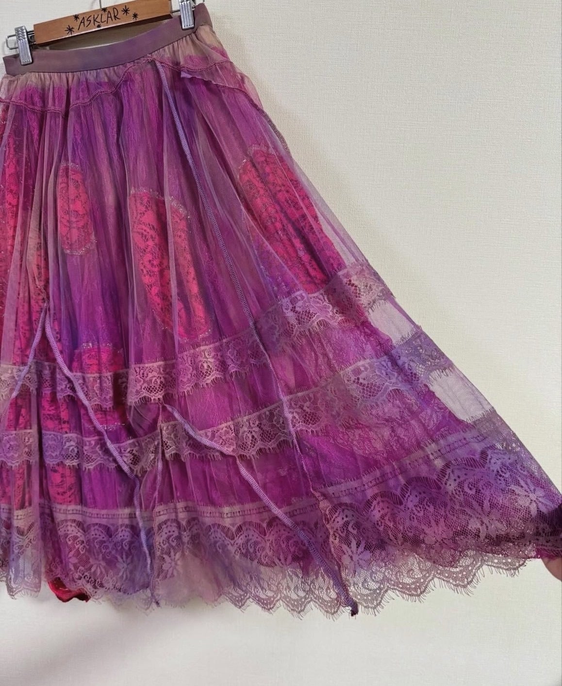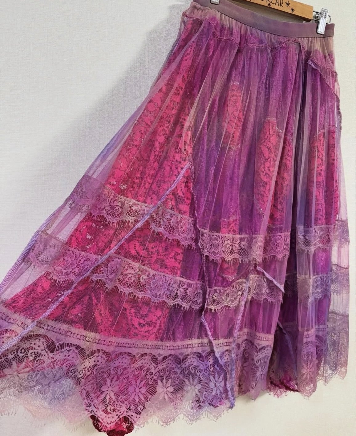 幾重にも重なったレースのスカートは、クリエイターの手描きのピンクカラーで構成されています。