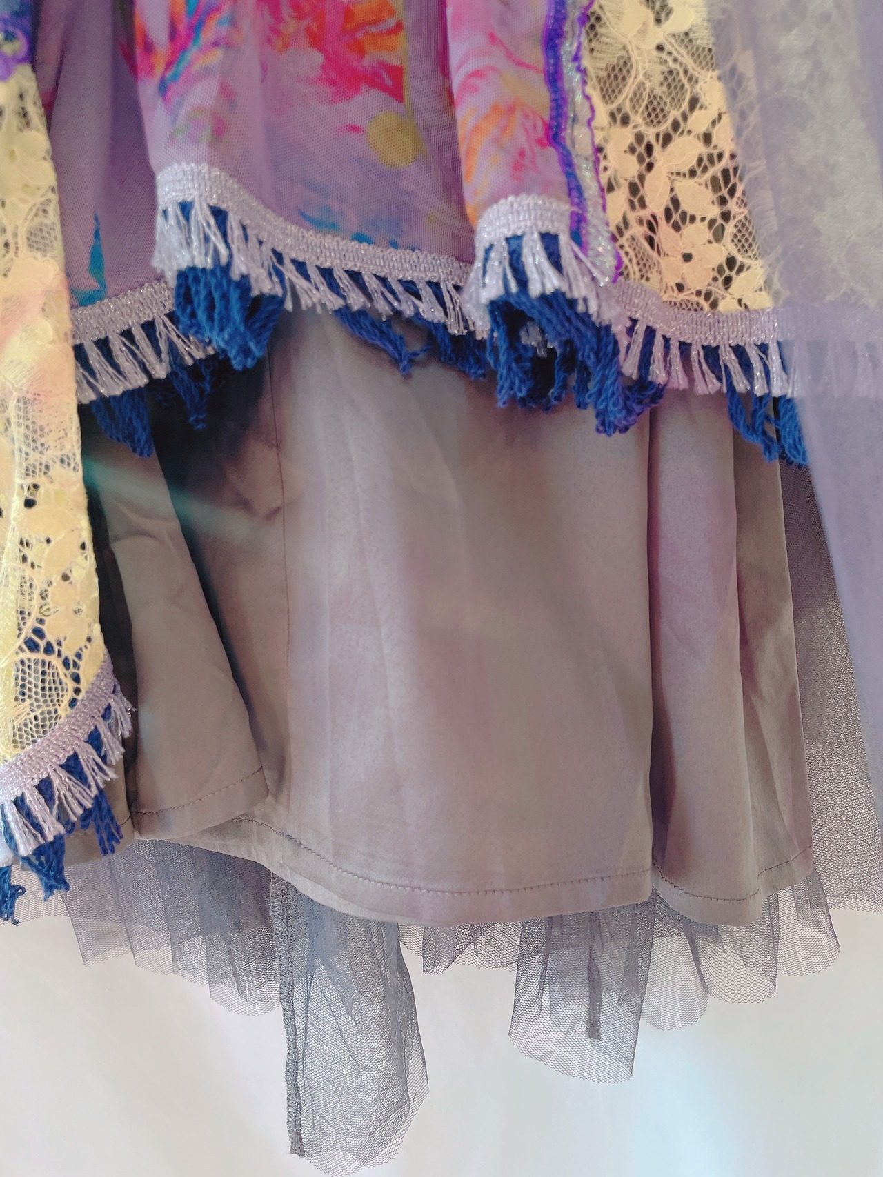 パープルの鮮やかな色合いが印象的なアートレーススカート。多彩なレースのディテールが施されており、着るたびに新しい表情を楽しめます。軽やかな生地感で、動くたびに揺れるシルエットが華やかさを添え、特別なシーンにもぴったりです。