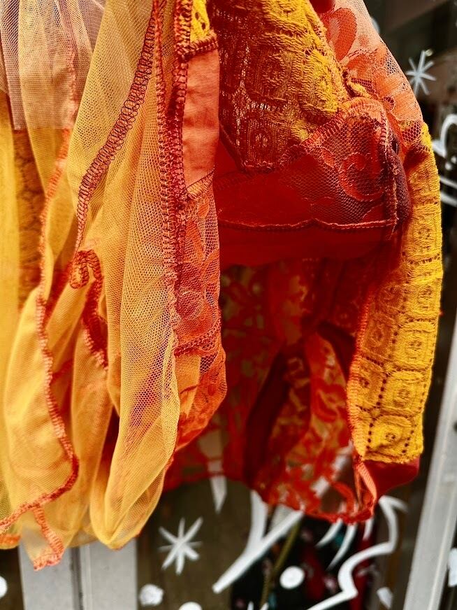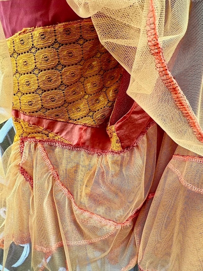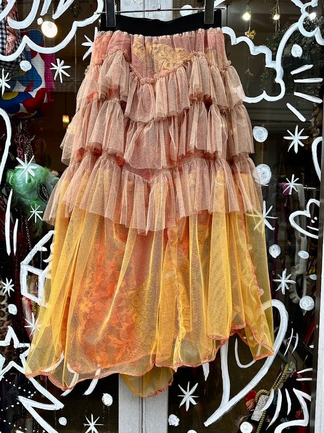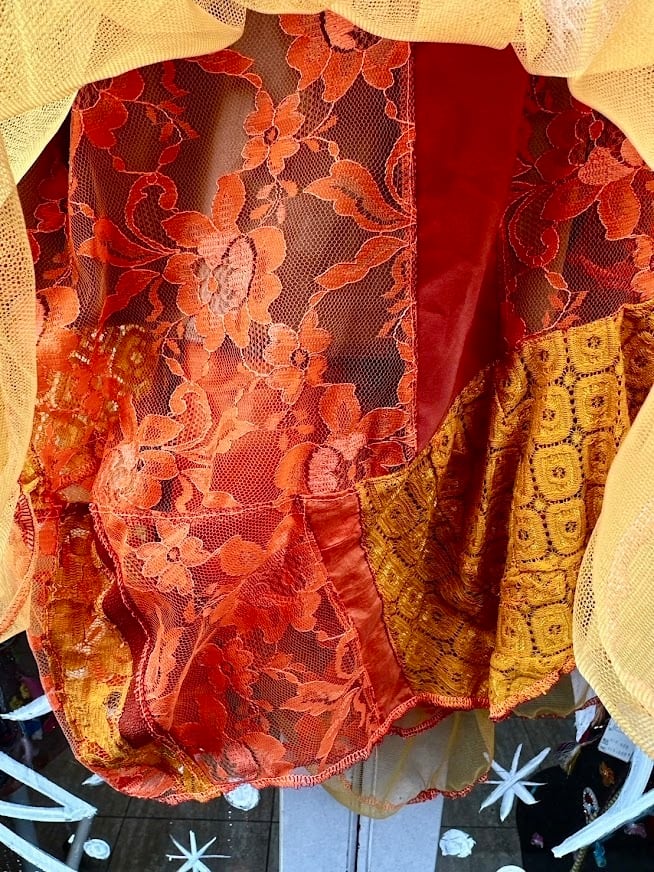 色とりどりの幾重にも重なったレースのアートスティックなパッチワークが魅力的な、クレイジーパッチワークスカート。