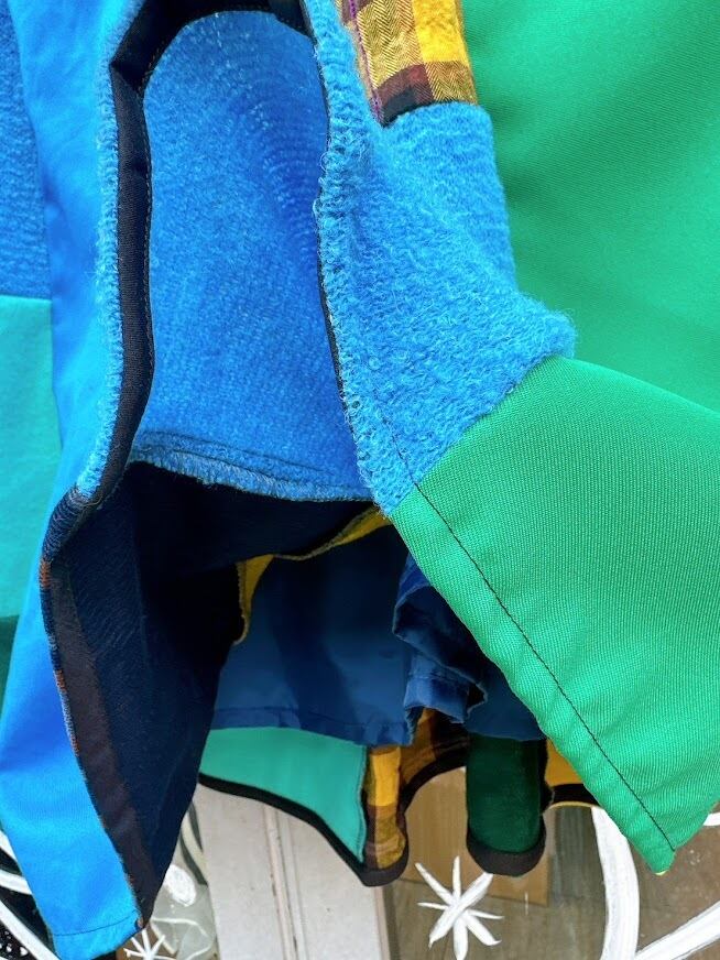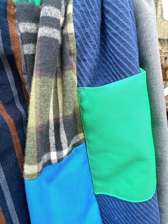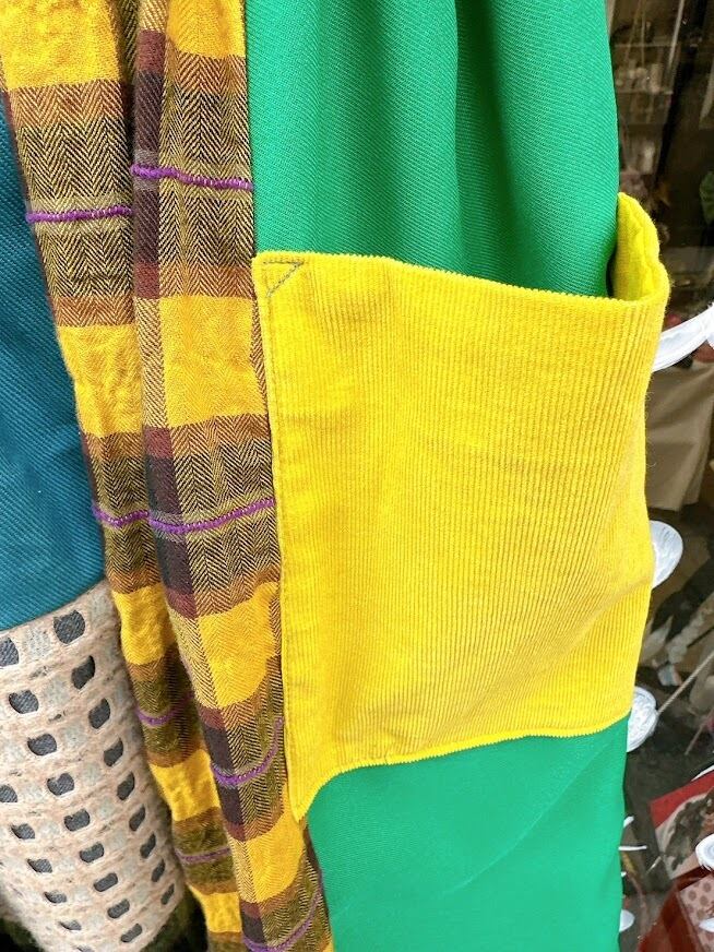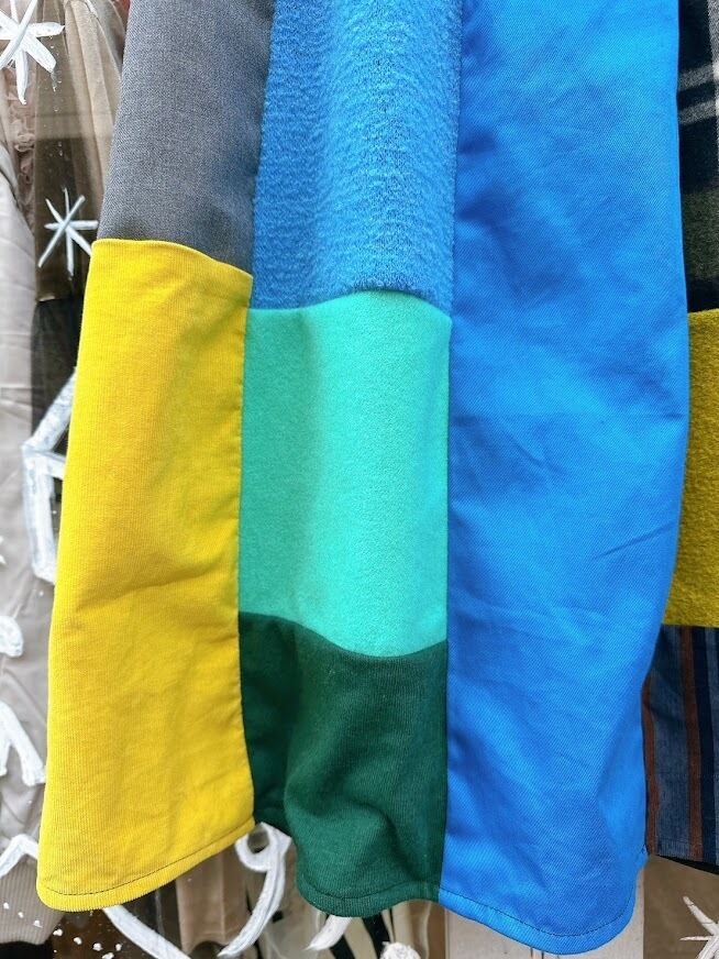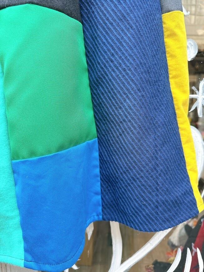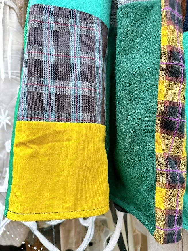 さまざまなテクスチャーや色合いの生地が組み合わさり、一つ一つ異なる魅力を放つパッチワークに仕上げています。シルエットはストンとしたラインで動きやすく、足元を軽やかに演出。あなたの個性をさらに引き立て、日常をより鮮やかにするアイテムとなることでしょう!