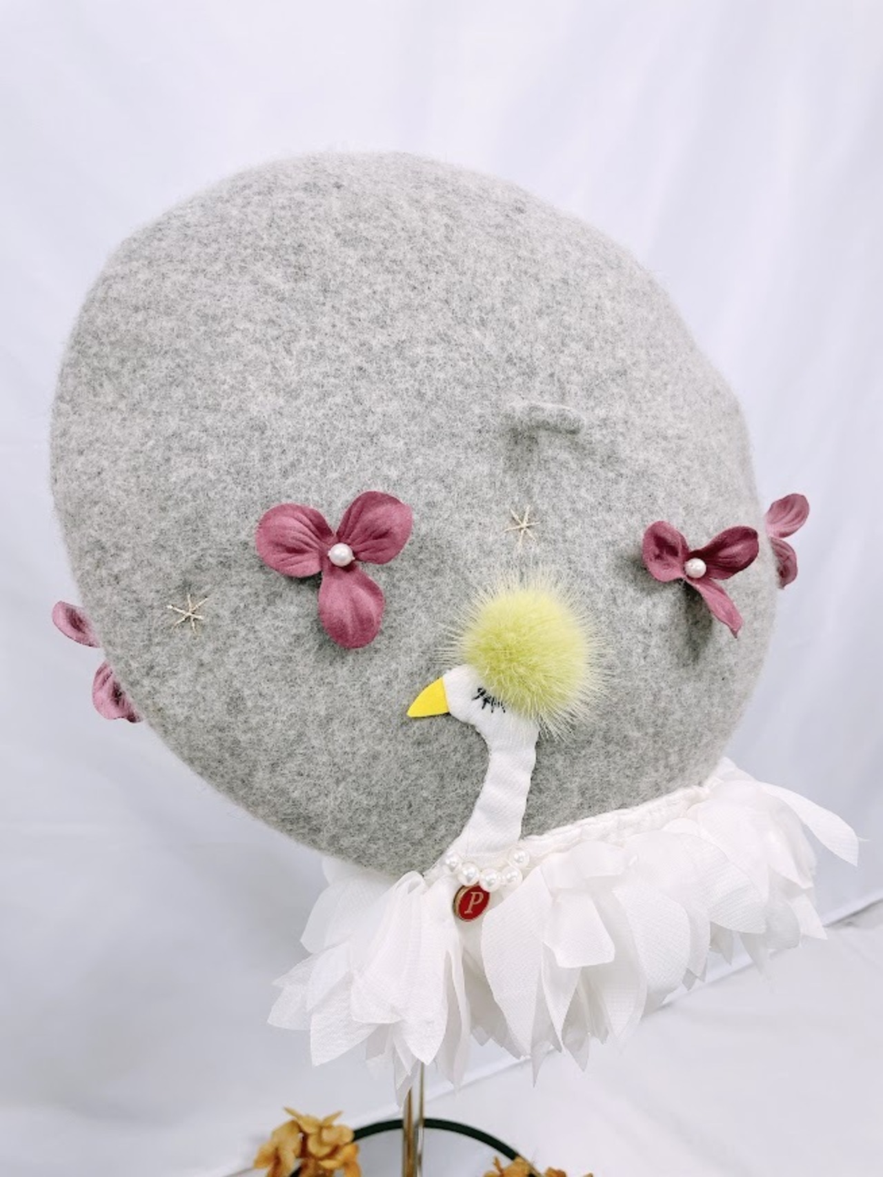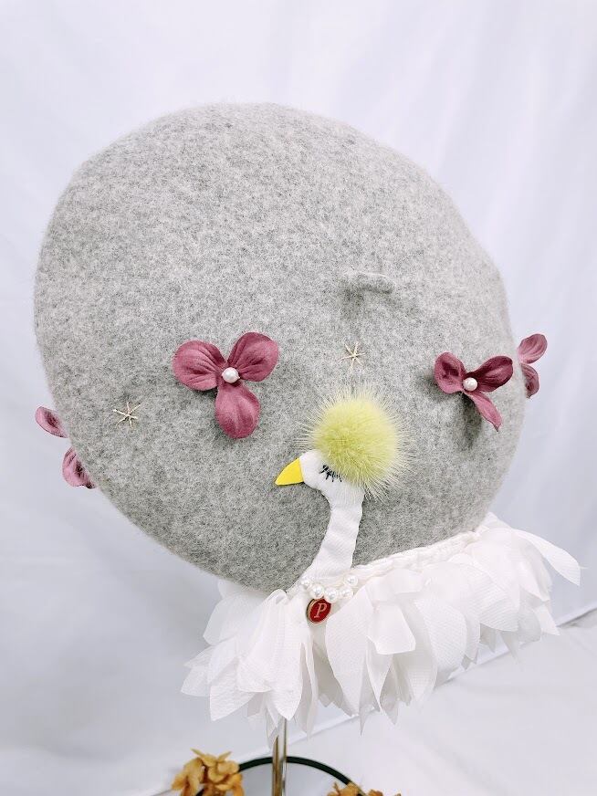 ハンドメイド ベレー帽スワン グレー【pheacadh】