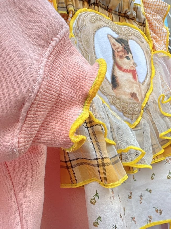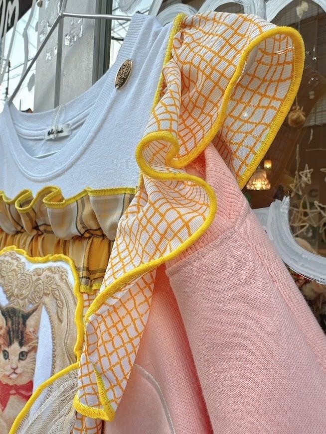 ネコの可愛らしいデザインが、あなたの魅力を引き立てる特長です。軽やかな素材感とフリルの揺れが、どの角度から見ても魅力的な印象を与え、周囲の視線を引き寄せます。このリメイクフリルトップスを身にまとうことで、日常を少し特別に彩ることができるでしょう!