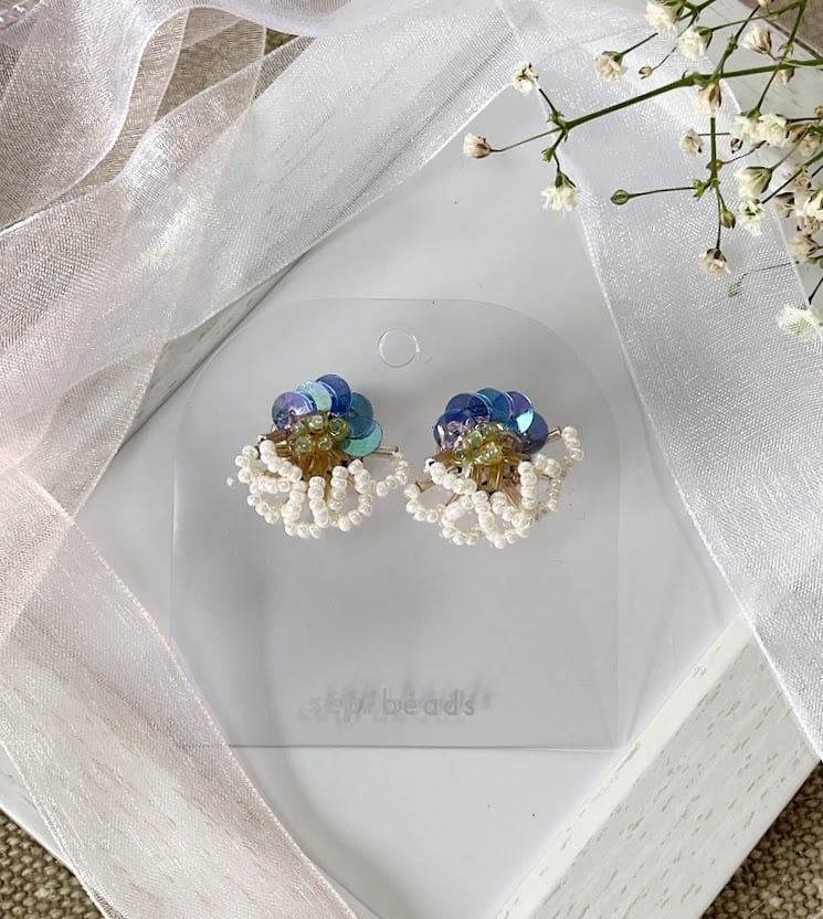 ハンドメイド Coralイヤリング【sep.beads】は、爽やかなブルーと清楚なホワイトの美しいコントラストが特長のアクセサリーです。洗練された色合いが顔周りを華やかに彩り、特別な日からカジュアルなお出かけまで幅広く活躍するアイテムです!見る人の目を惹くこと間違いありません!