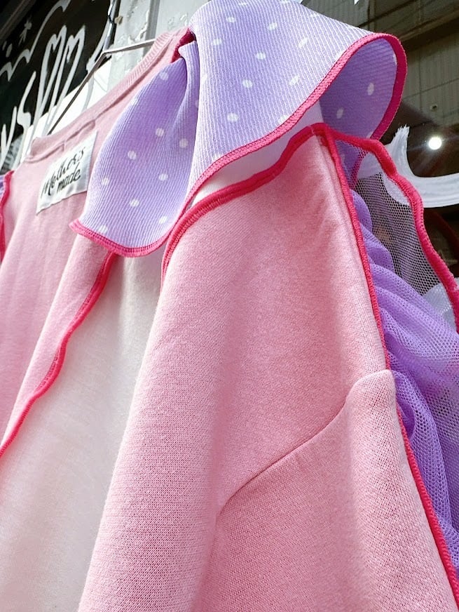 職人の手によって丁寧に仕上げられた、可愛らしいフリルデザインが魅力のリメイクスウェットです。柔らかなピンク色が、日常のコーディネートに優しさを添えます。