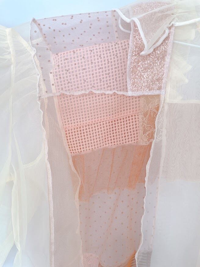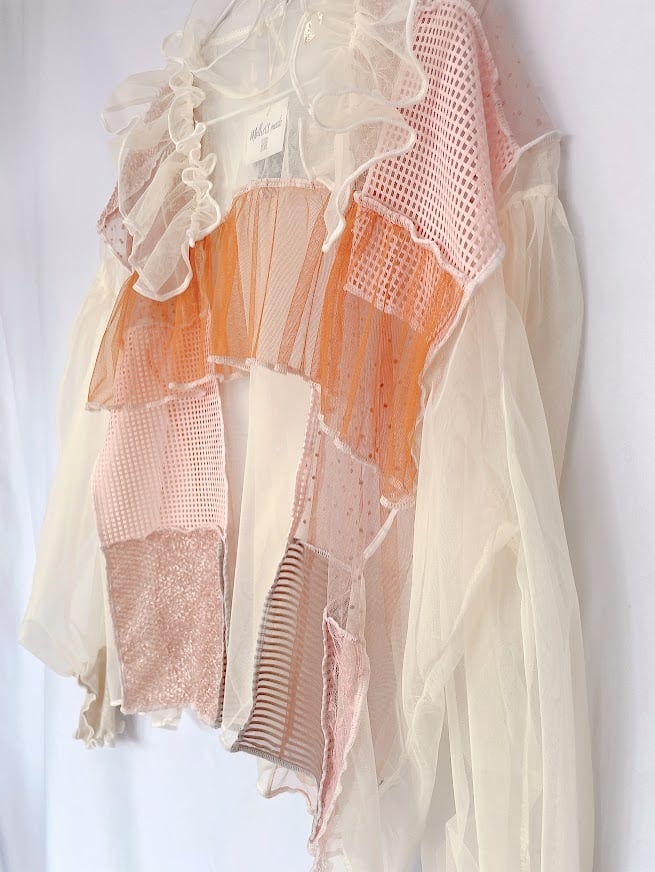 職人の手によって丁寧に仕上げられた、エレガントなシフォントップスが魅力のリメイクアイテムです。柔らかなベージュの色合いが、日常のコーディネートに華やかさを添えます。