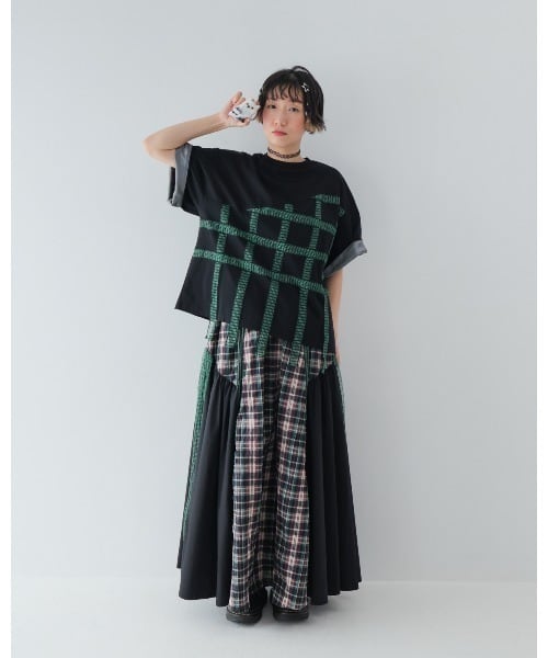 チェックテープTシャツ〈ブラック×グリーン〉【unica】