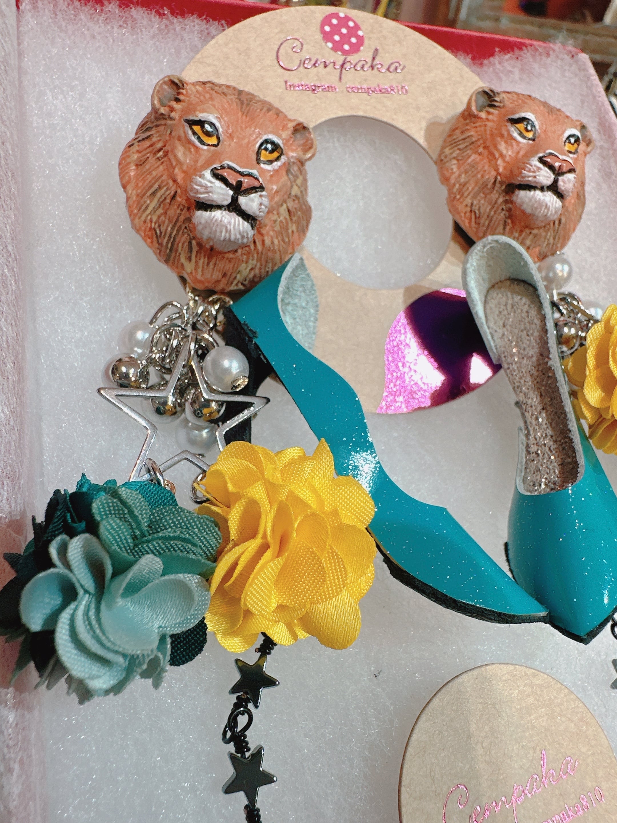 ハイヒールピアス ライオンボタン×お花ポンポン 【cempaka】