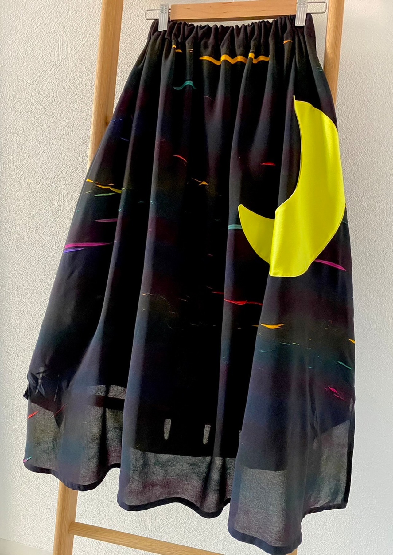 夜の街並みと、三日月のお月さまを、表現した一点ものスカートです。