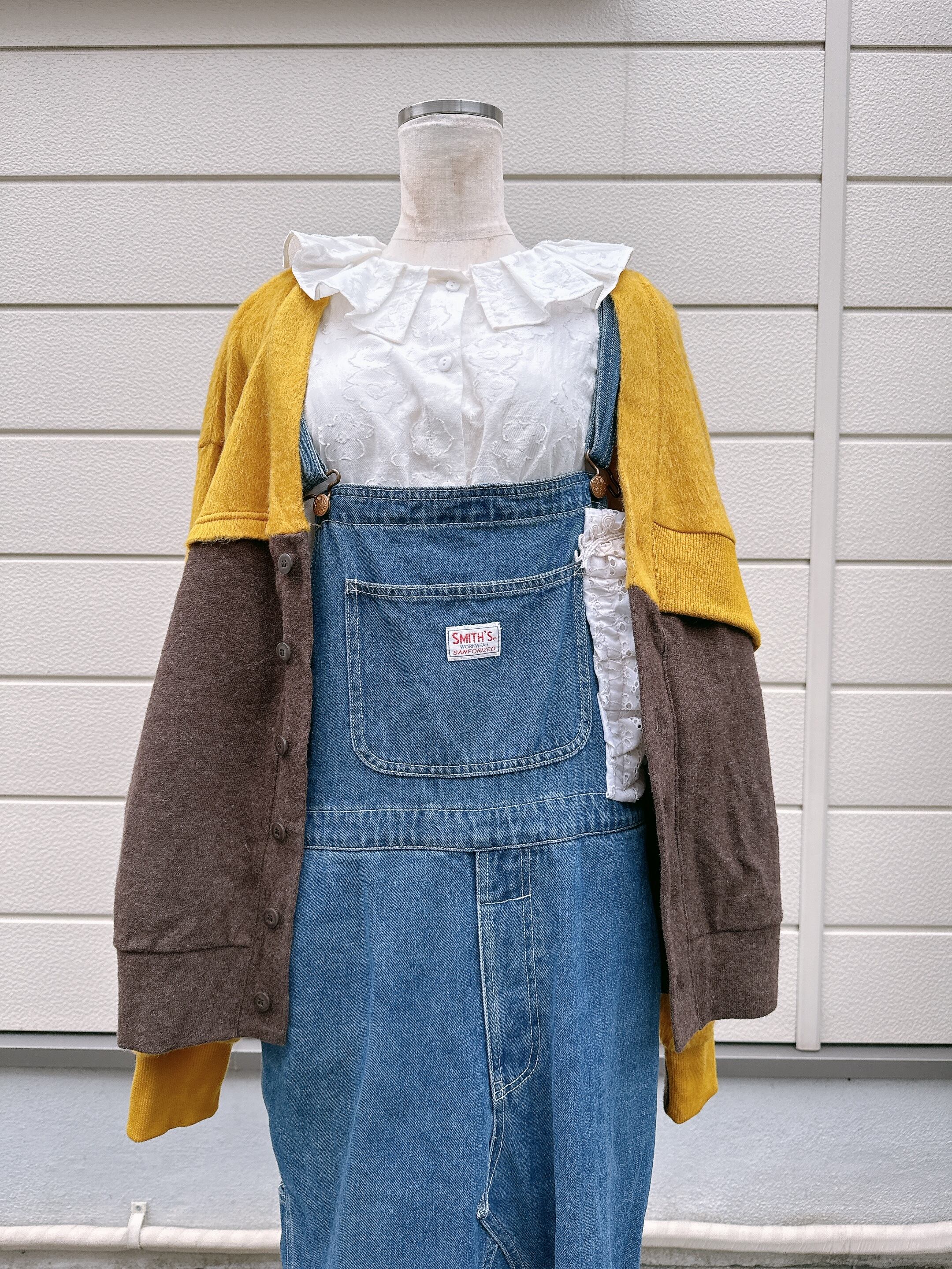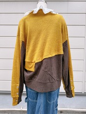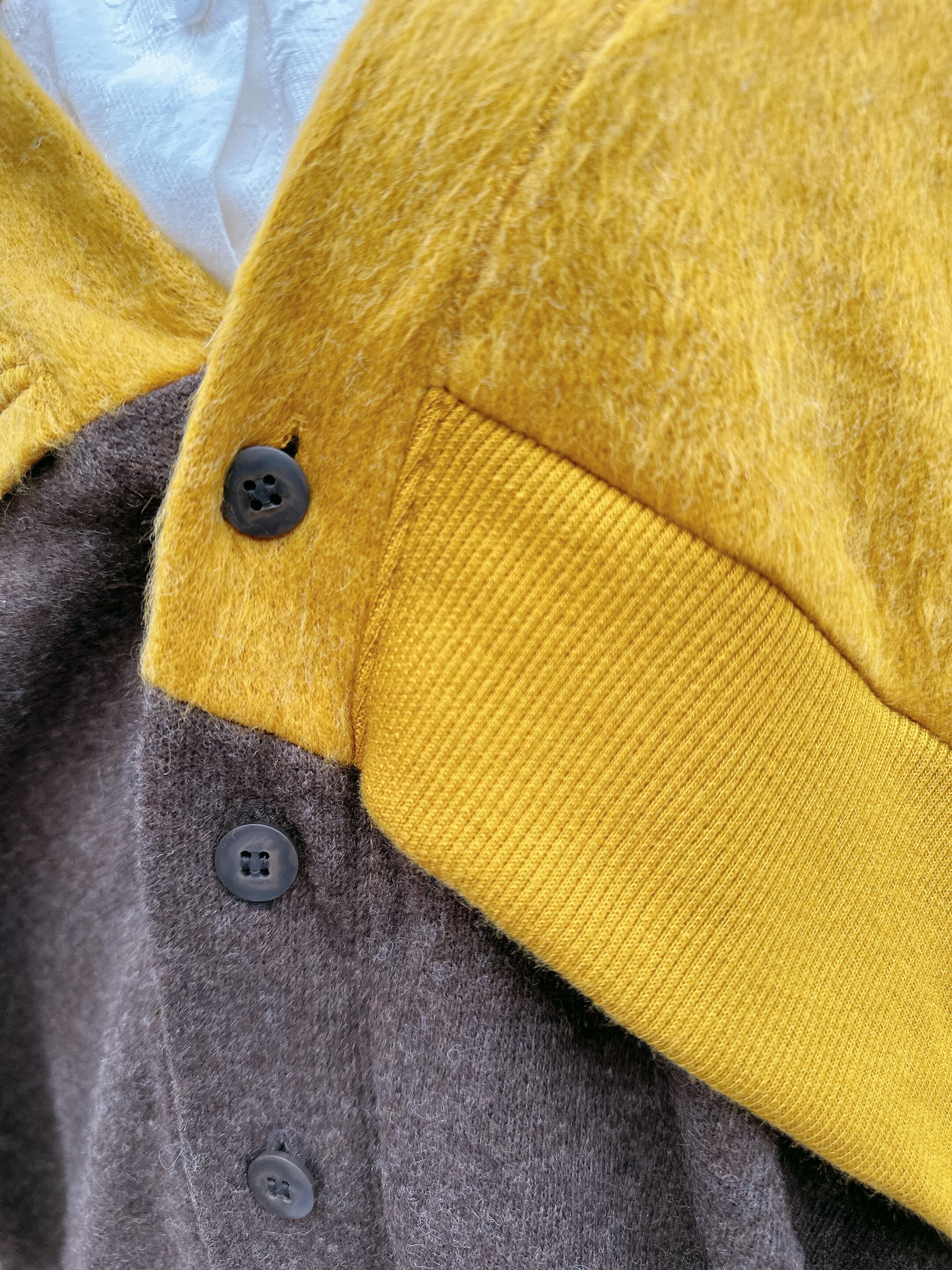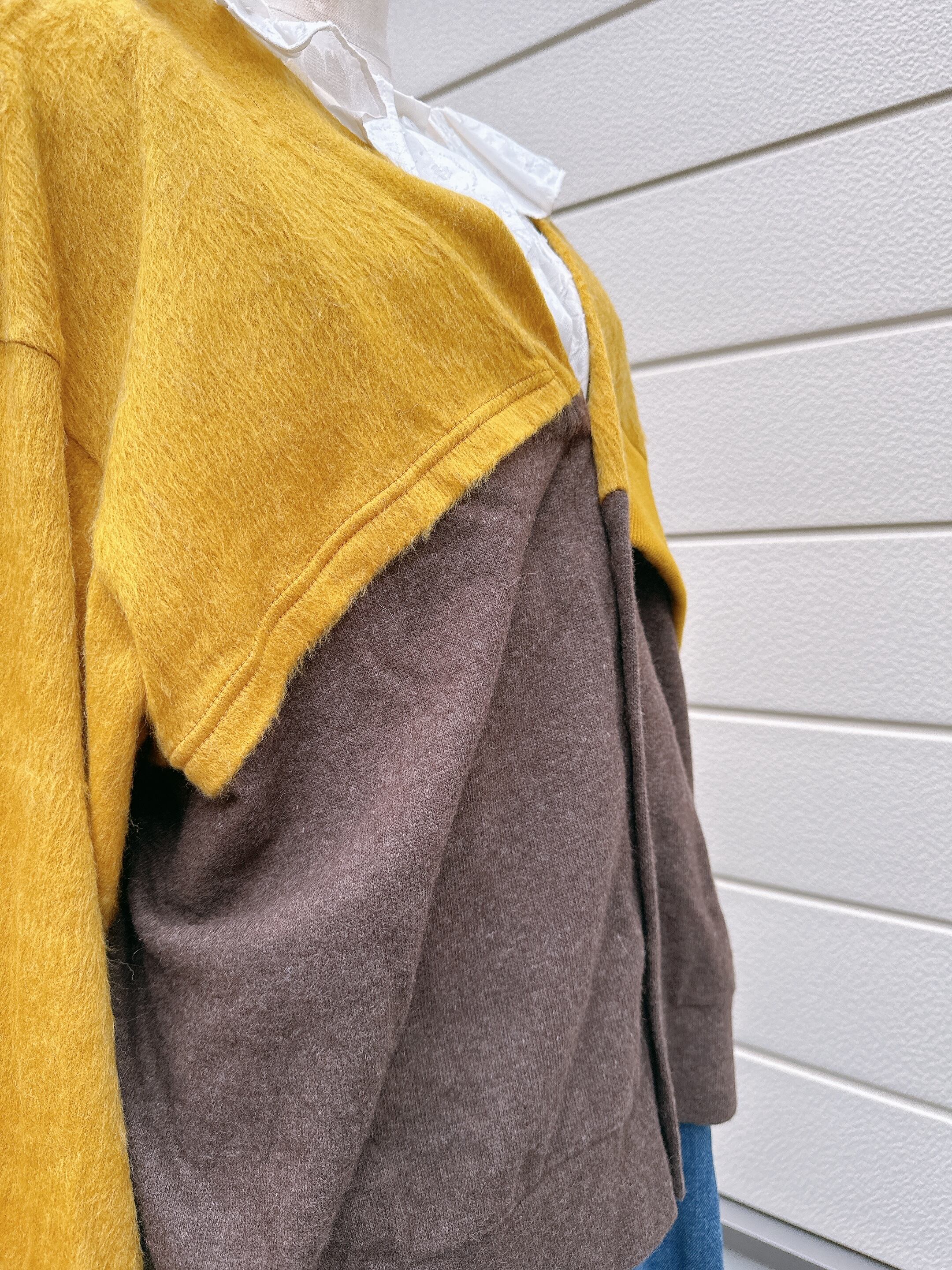 マスタードカラーとブラウンのコンビネーションのミックスカーディガン。