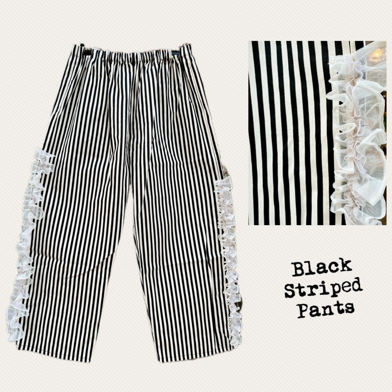 サイドのフリルがアクセントになった、ストライプ柄パンツ。
