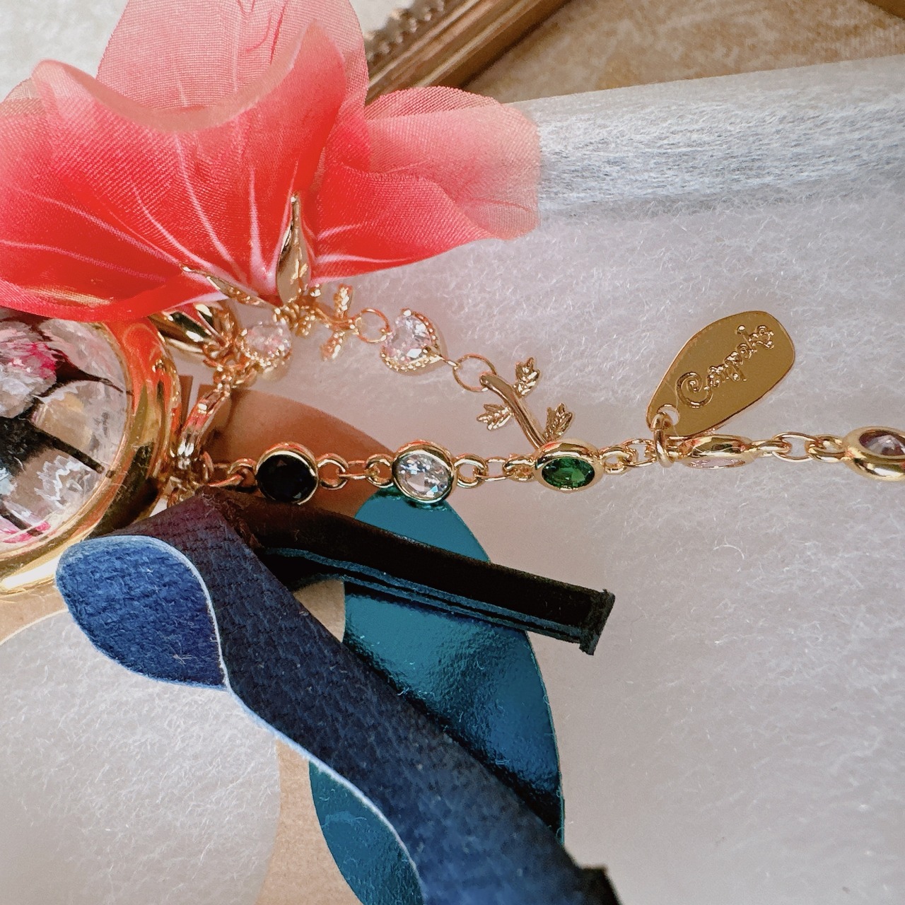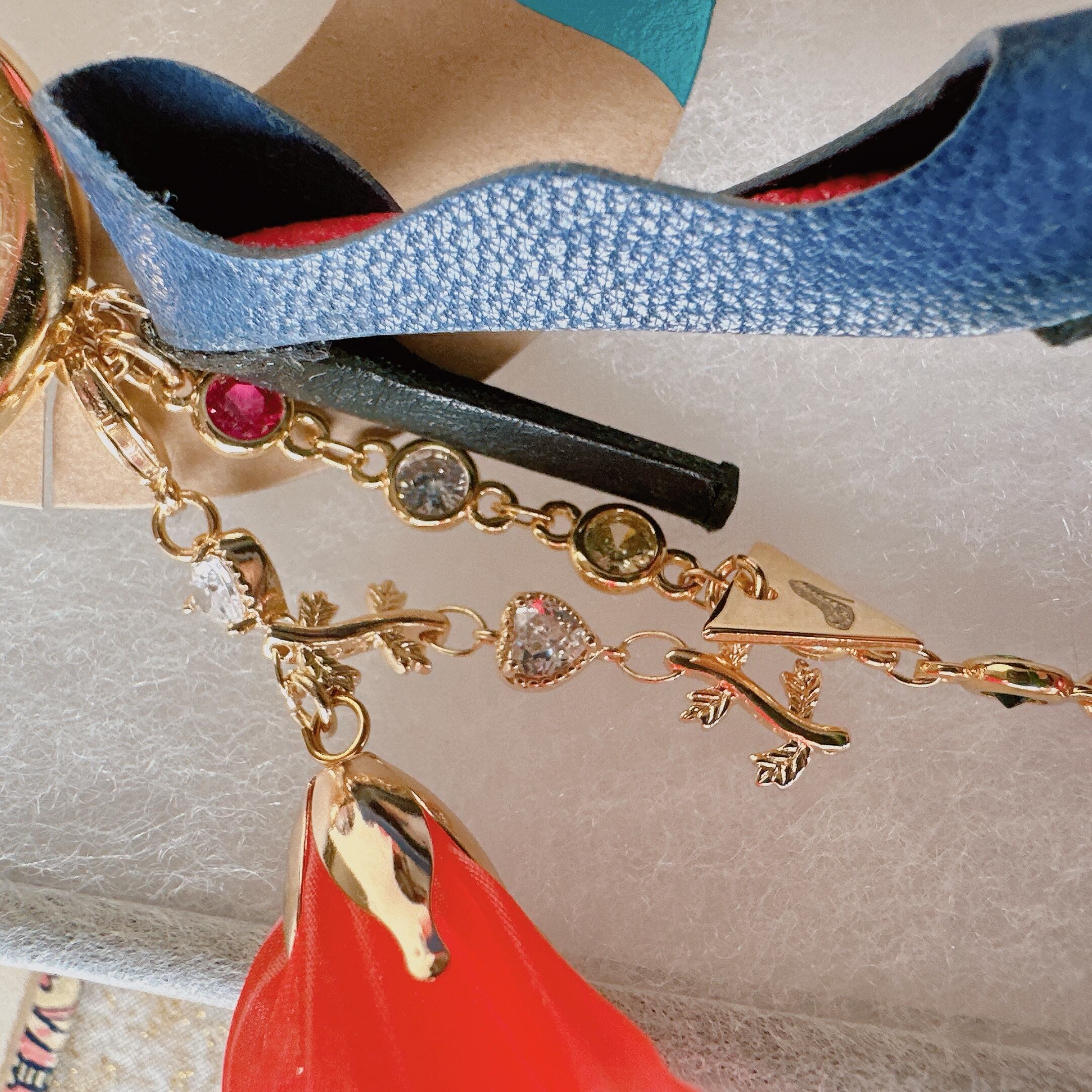 色んな模様のハイヒールに、賑やかな楽しいパーツ、海外のボタンなどで組み合わせられた、一点ものになります。