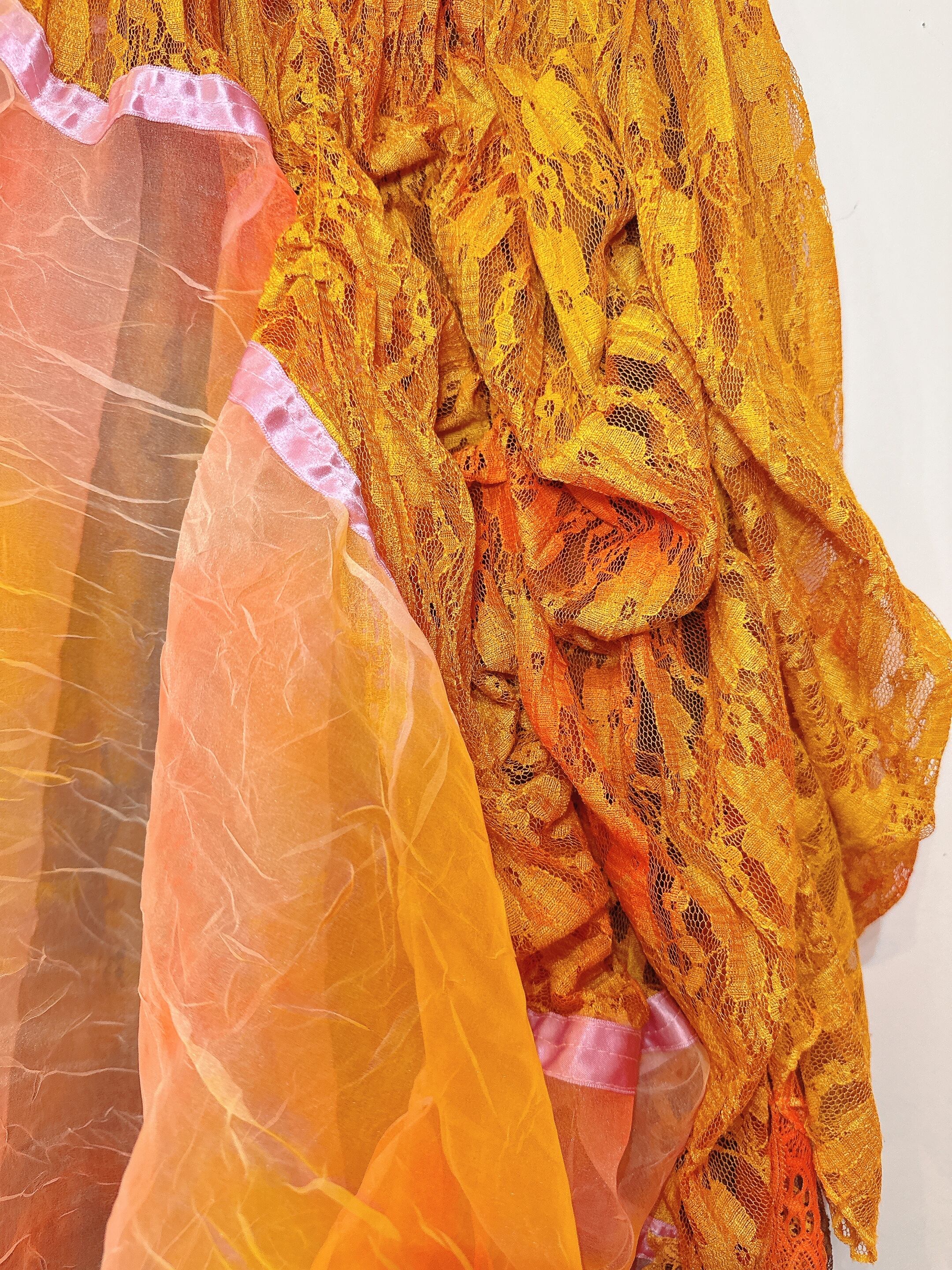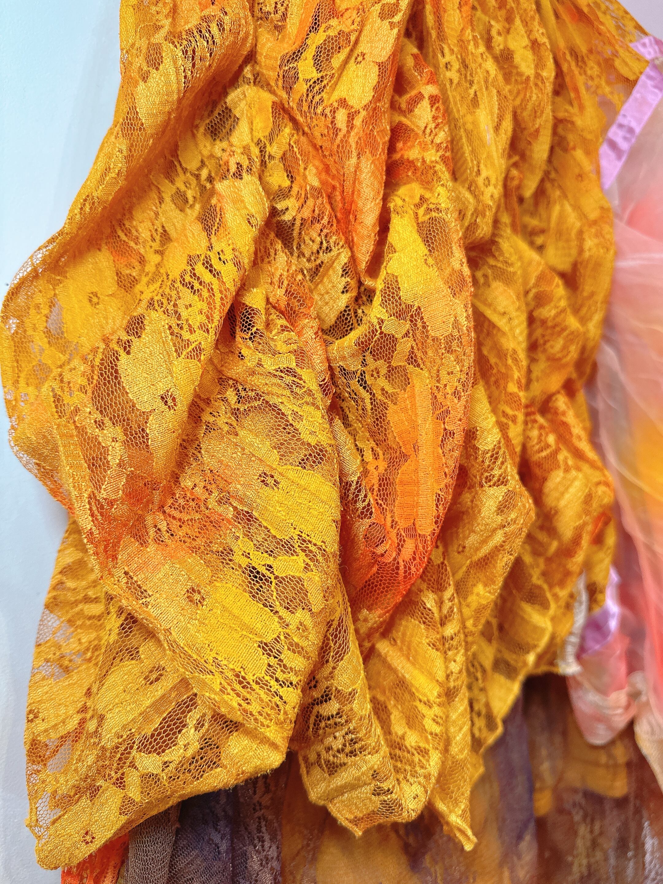 深いイエローのレースがベースになったドレープいっぱいのスカート。