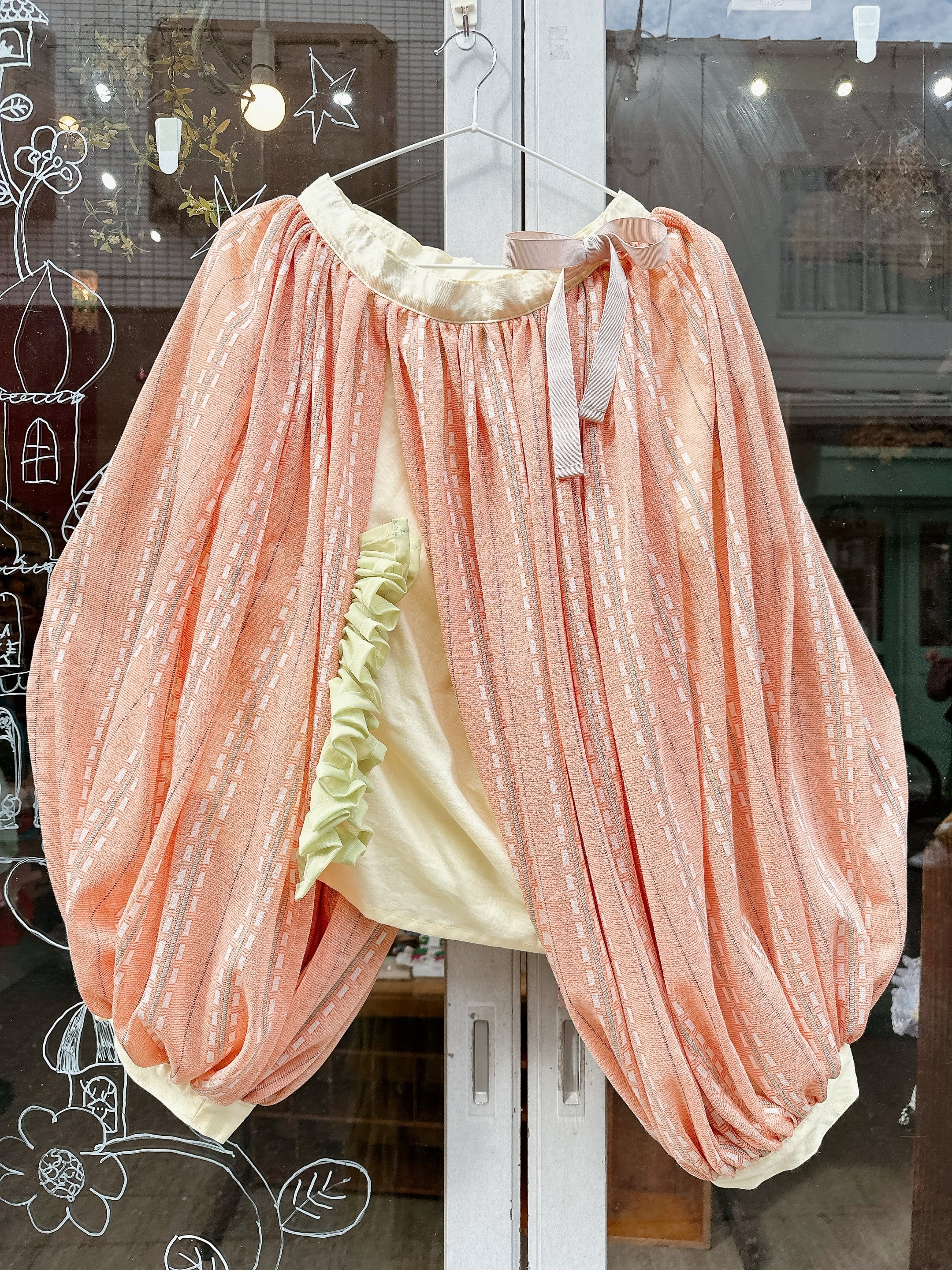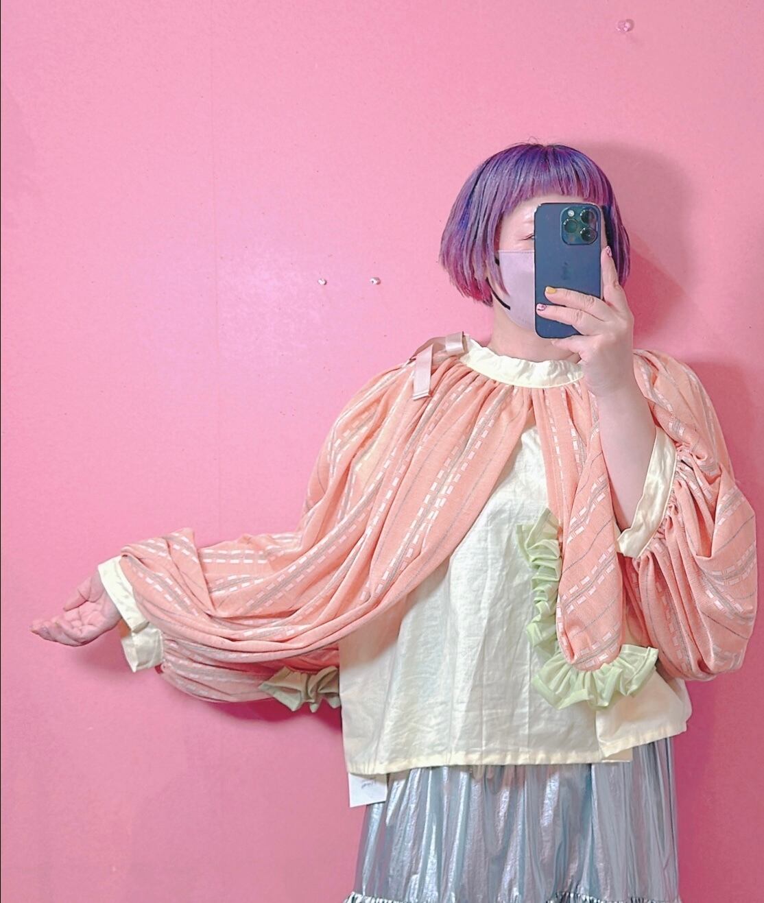 お袖のドレープがかわいい、優しい色合いのトップスです。