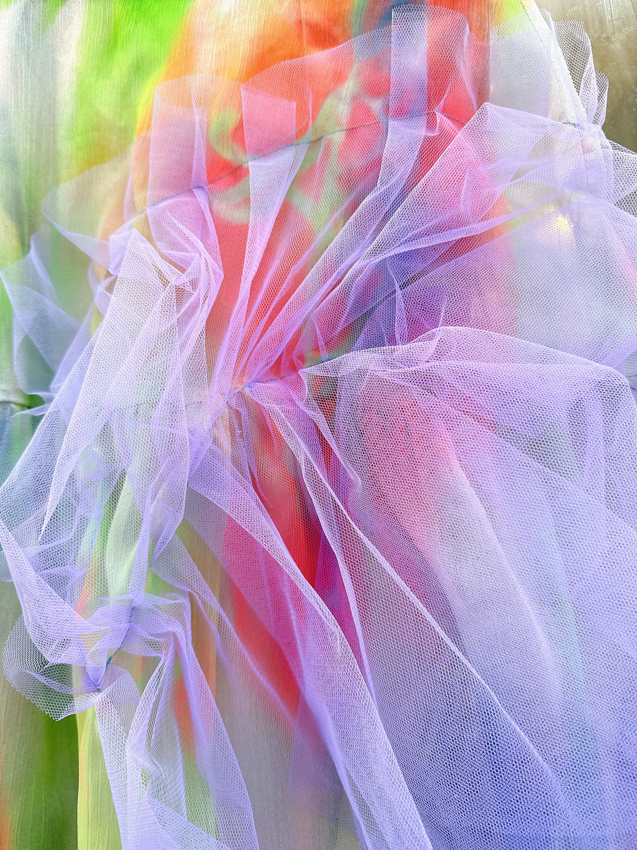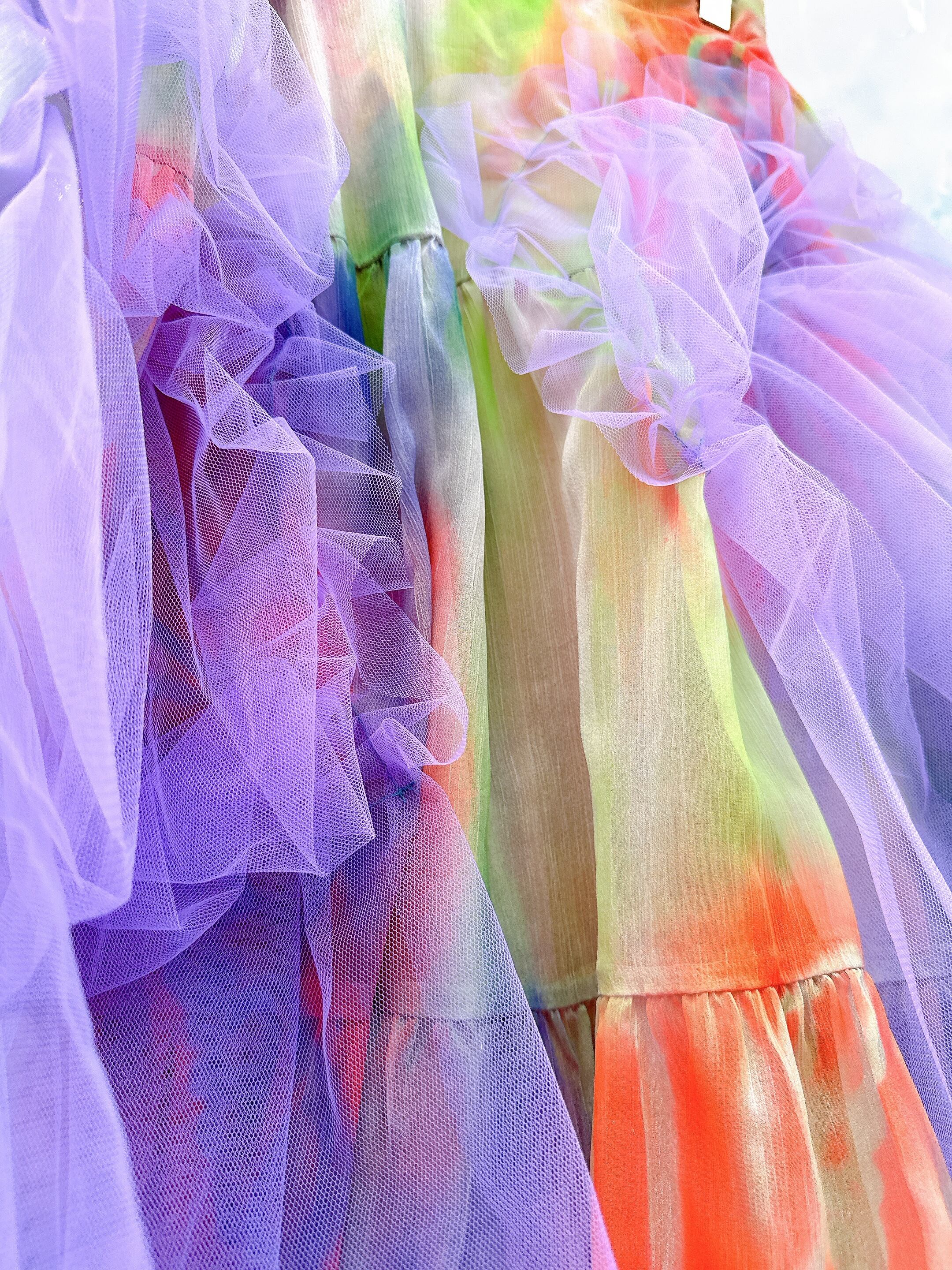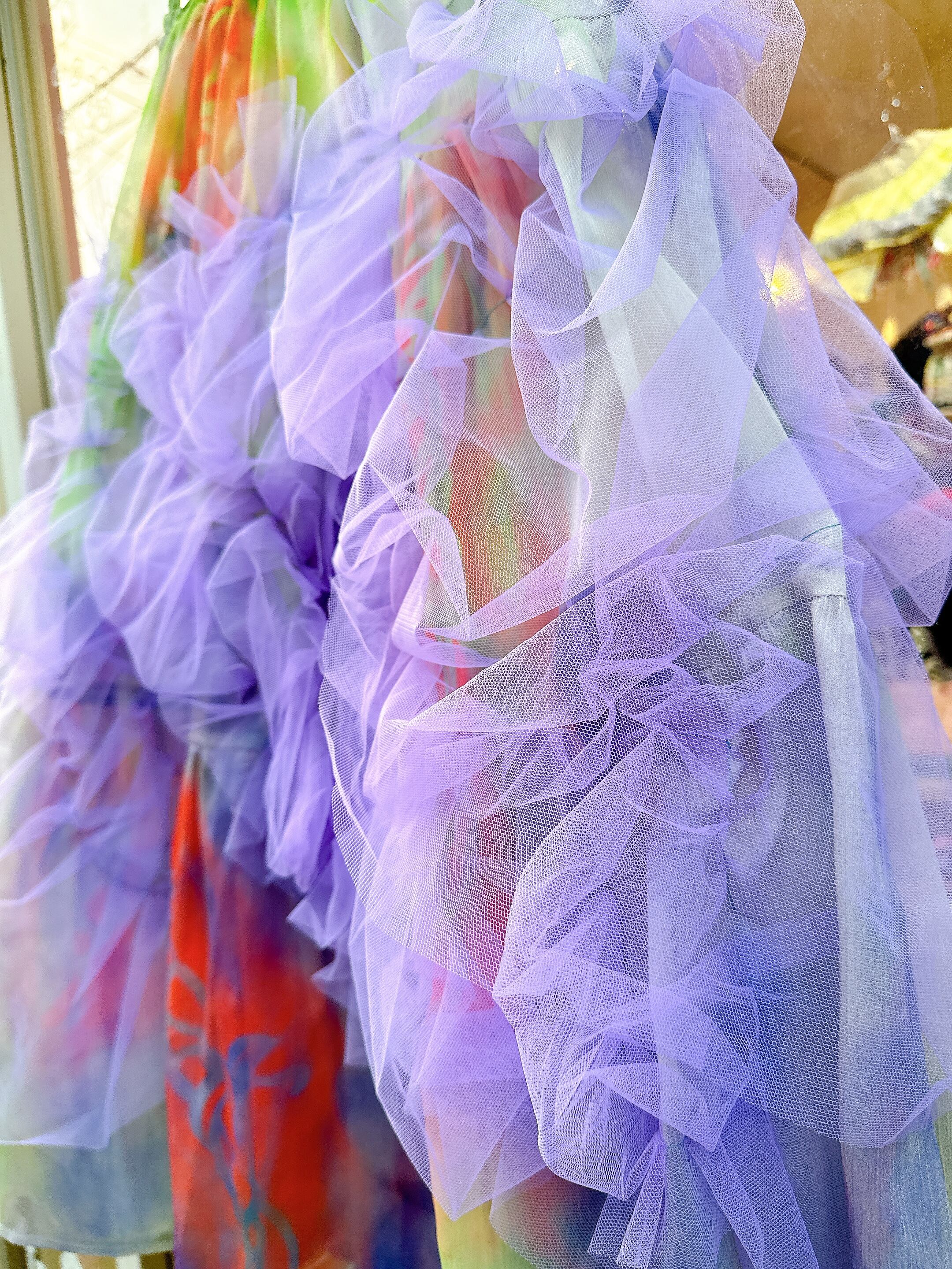 パープルとグリーンの夢のコラボレーションのようなスカートは、ふんわりチュールのスカート。*・゜゚・*:.。..。.:*