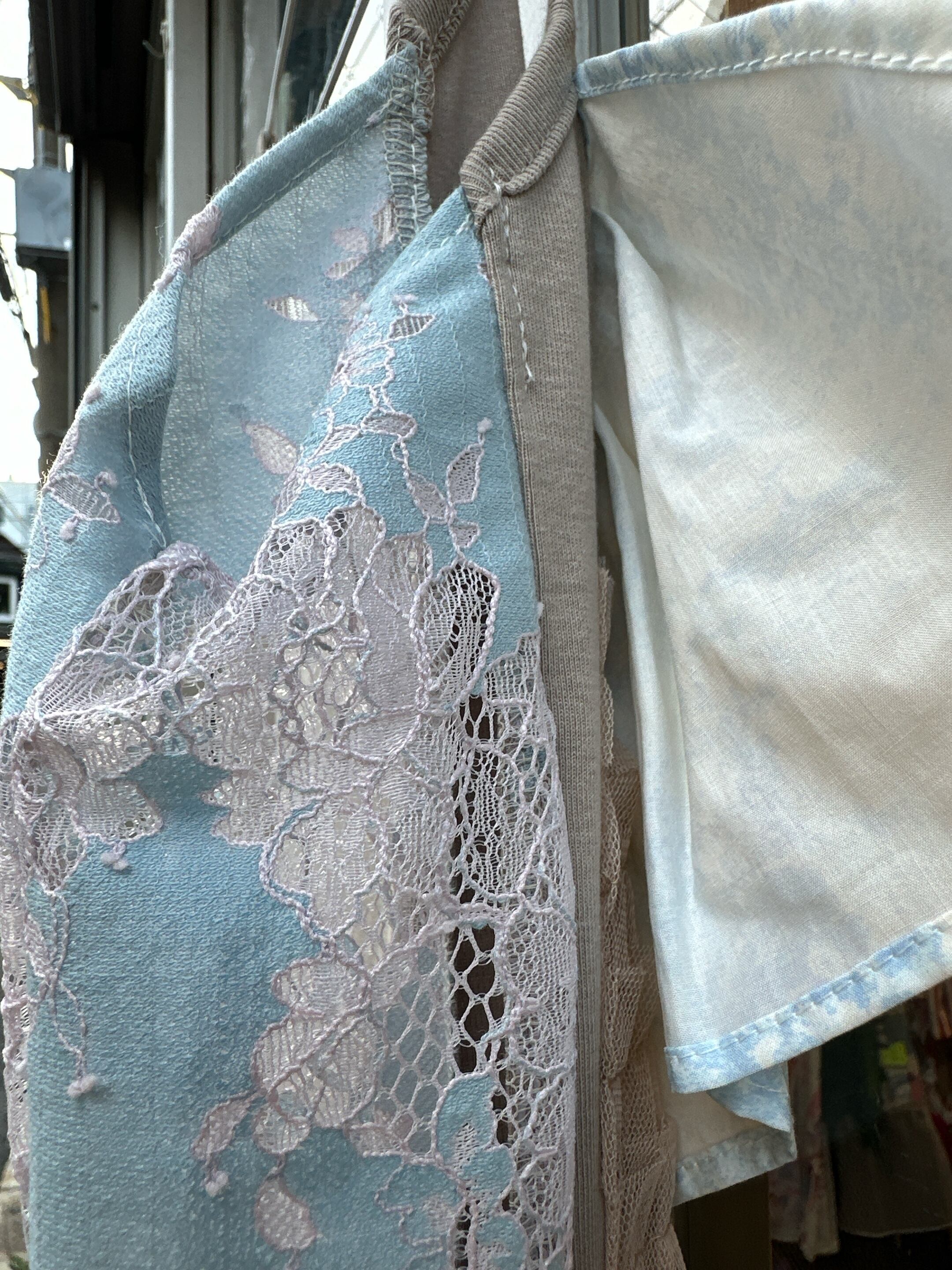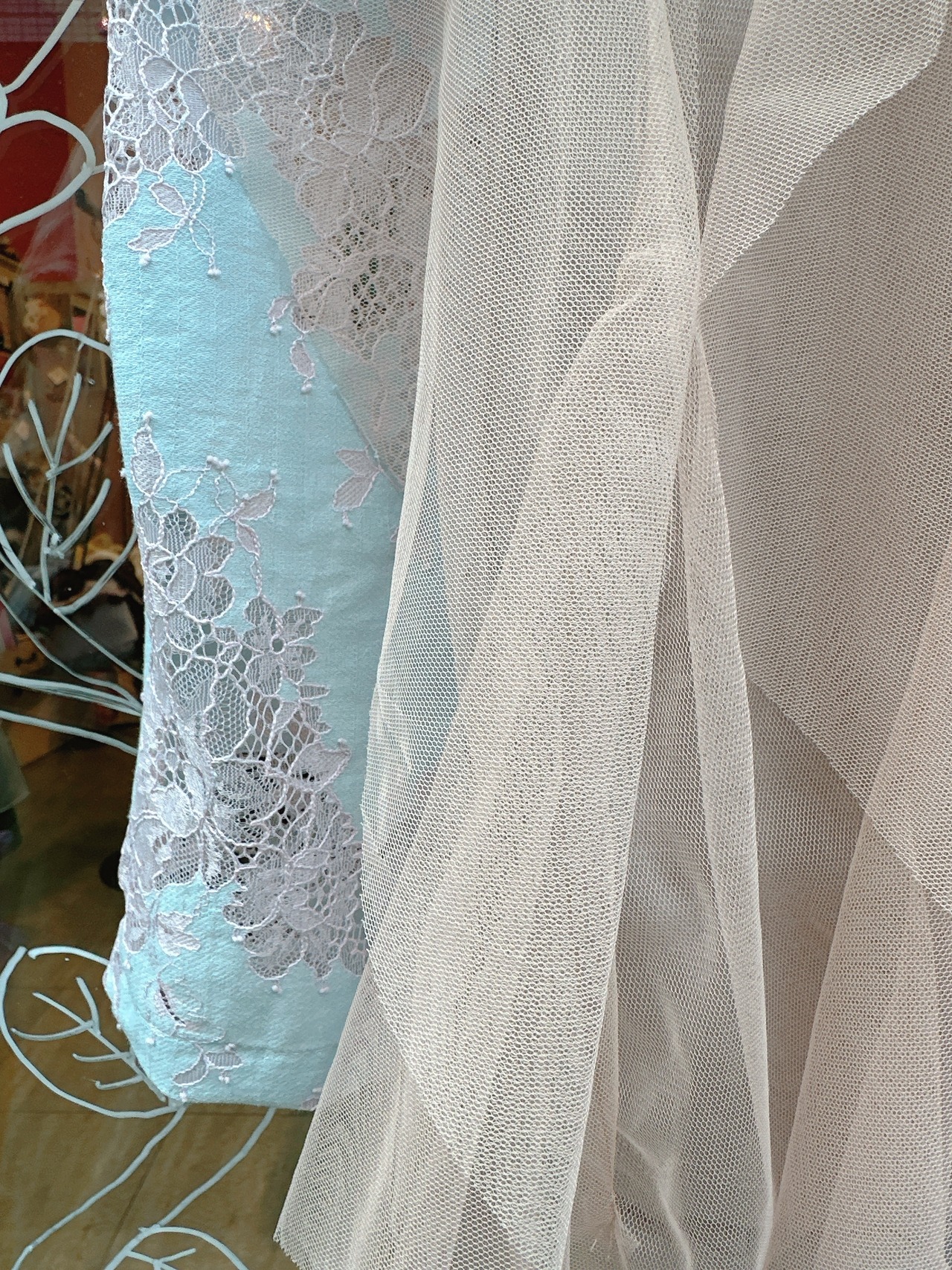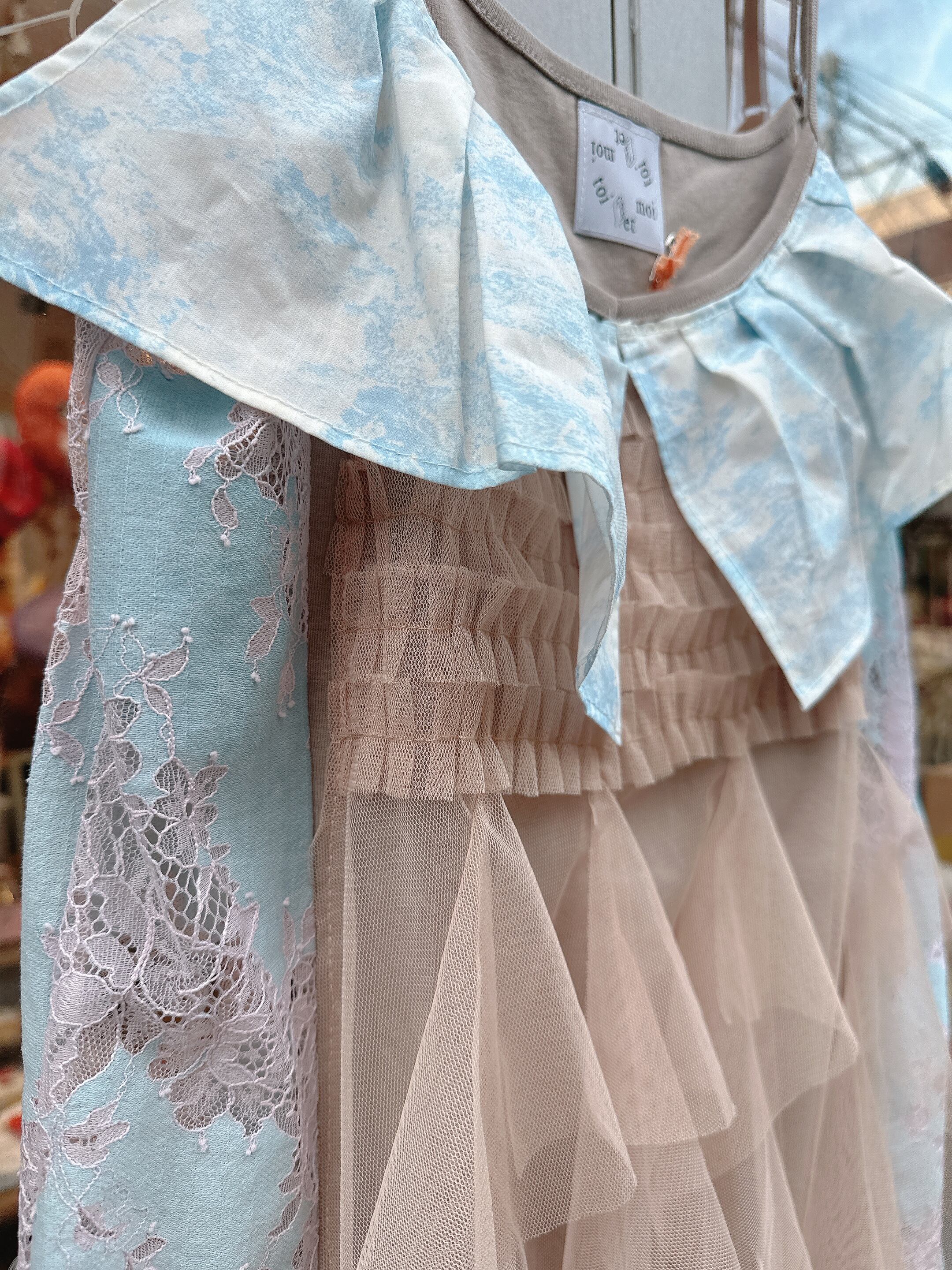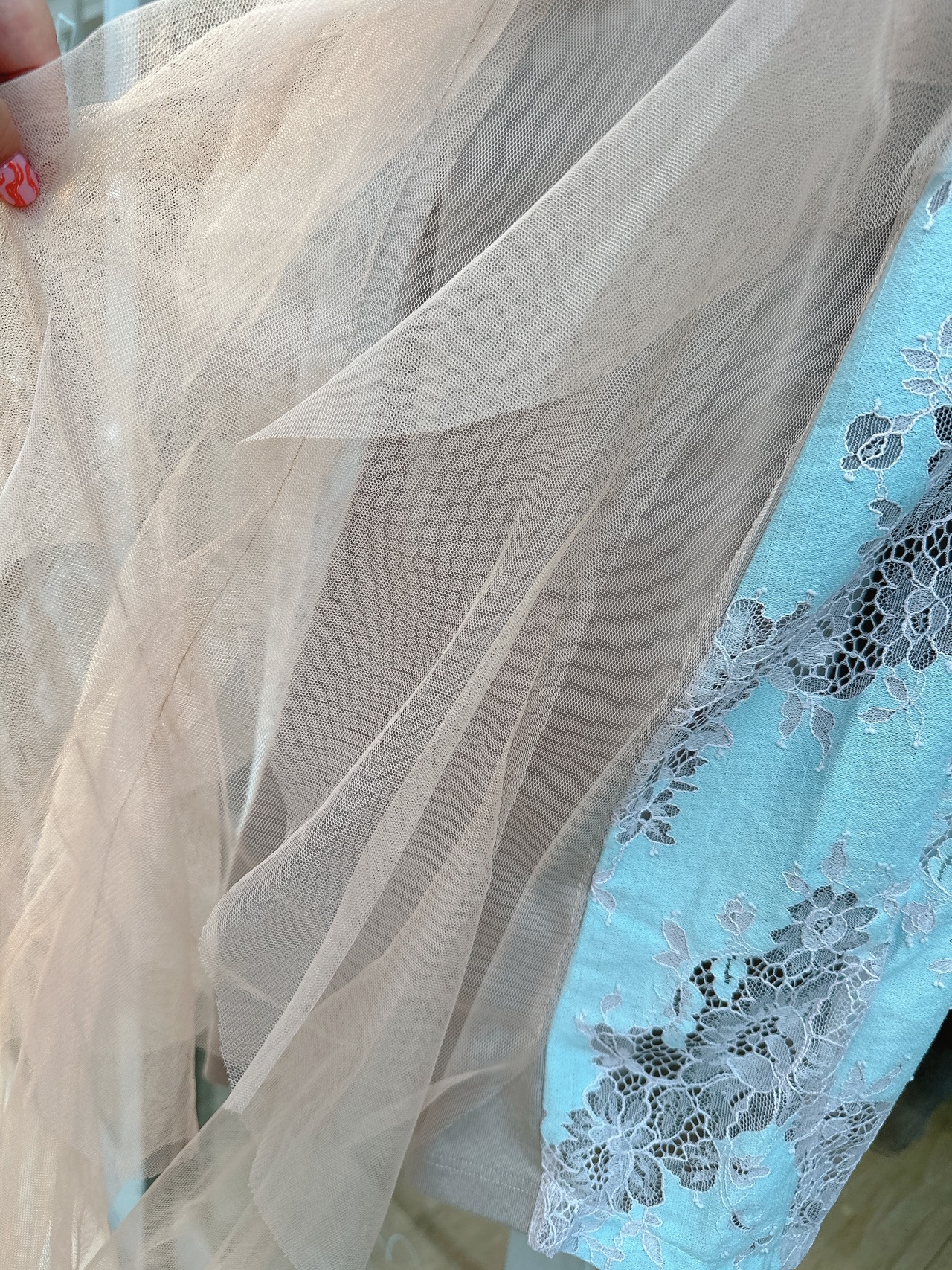 女性らしい繊細な透け感のあるレースをサイドに、ベージュカラーとニュアンスブルーが、落ち着いたレディな感じのデザインです。